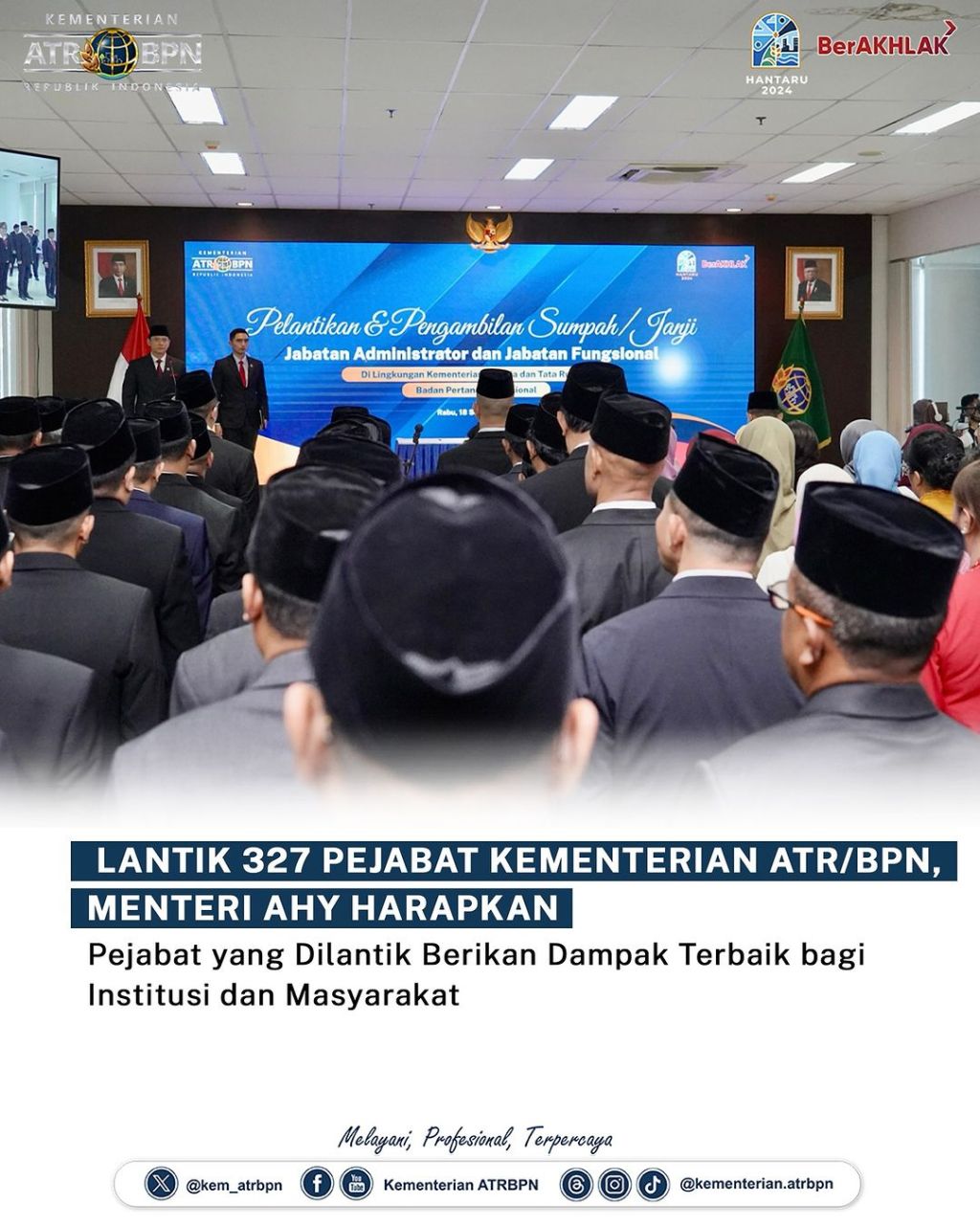 Menteri Agraria dan Tata Ruang/Kepala Badan Pertanahan Nasional (ATR/BPN), Agus Harimurti Yudhoyono (AHY) melantik 327 pegawai yang terdiri dari 310 Pejabat Administrator dan 17 Pejabat Fungsional pada Rabu (18/09/2024). Ia berharap, para pejabat terlantik akan siap mengabdi untuk bangsa Indonesia.