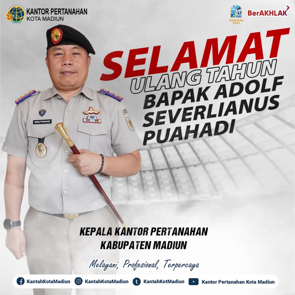 Segenap keluarga besar Kantor Pertanahan Kota Madiun mengucapkan Selamat Ulang Tahun Kepala Kantor Pertanahan Kabupaten Madiun, Bapak Adolf Severlianus Puahadi, S.SiT., M.M.