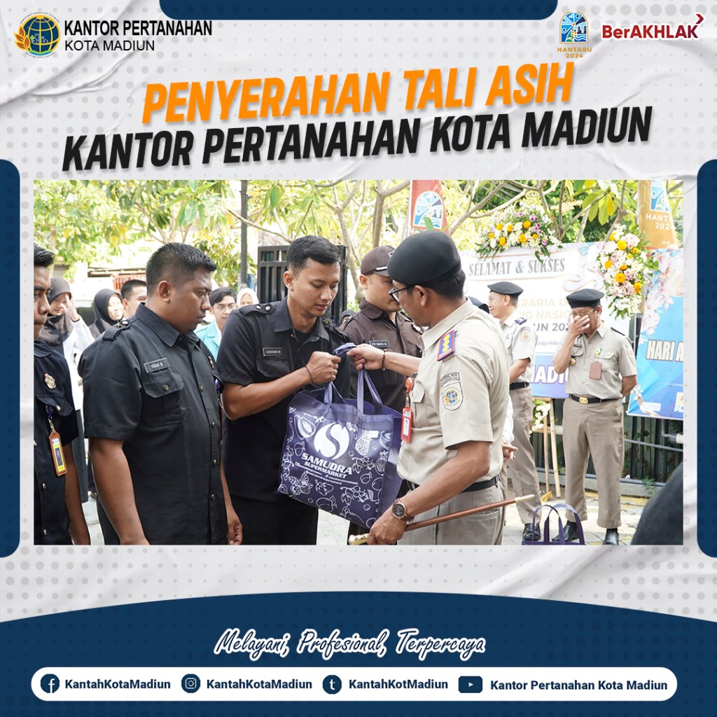 Halo #SobATRBPN, Hari ini Selasa (24/09/2024) Kepala Kantor Pertanahan Kota Madiun, Bapak Triawan Saleh, S.T., M.Si. mewakili Kantor Pertanahan Kota Madiun memberikan tali asih, pemberian tali asih tersebut dilaksanakan di Lapangan Kantor Pertanahan Kota Madiun. Pemberian tali asih ini sebagai silahturahmi untuk membangun komunikasi yang baik.