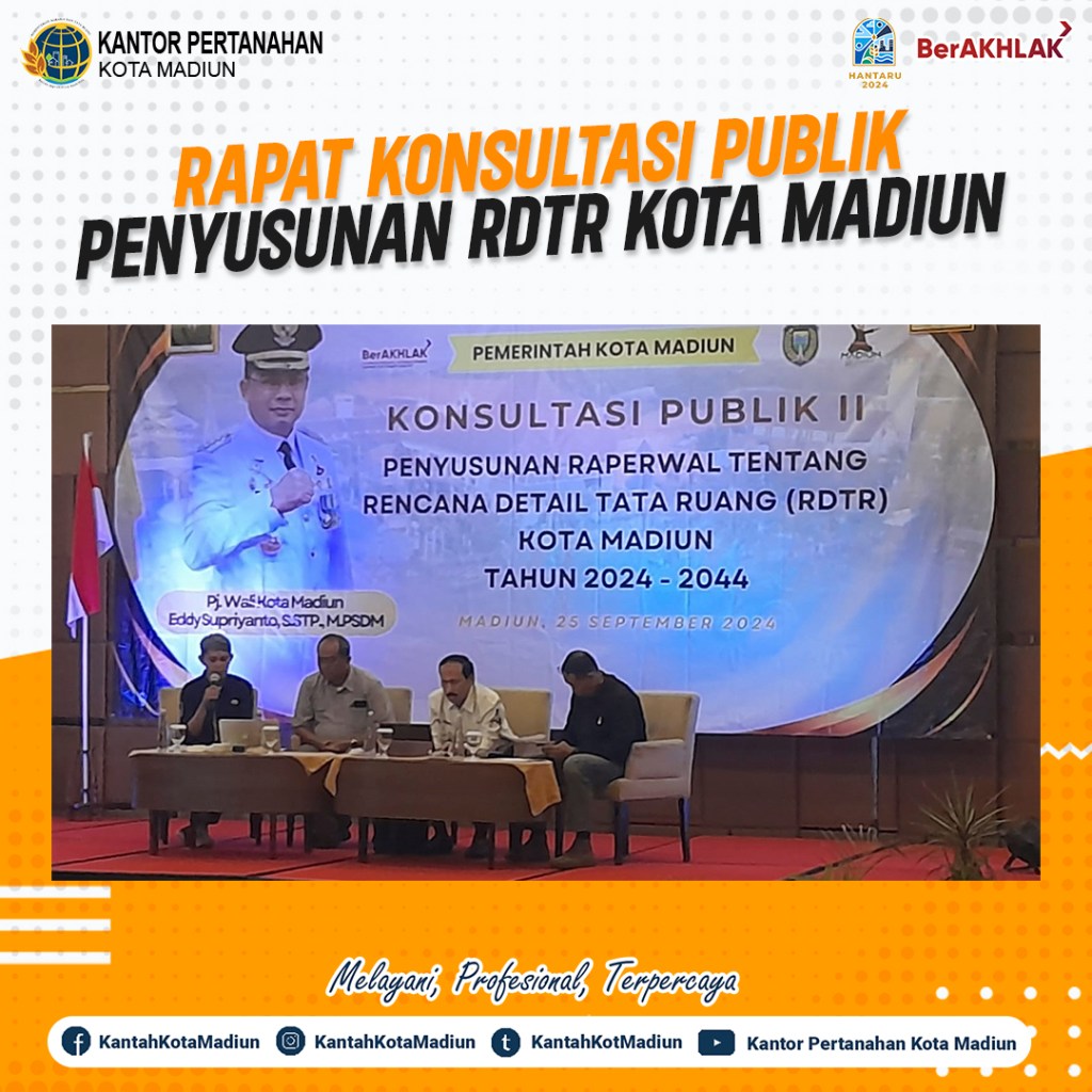 Halo #SobATRBPN, Hari ini Rabu (25/09/2024) Kantor Pertanahan Kota Madiun mengikuti Konsultasi Publik II dengan tema Penyusunan Raperwal tentang Rencana Detail Tata Ruang (RDTR) Kota Madiun Tahun 2024 – 2044.