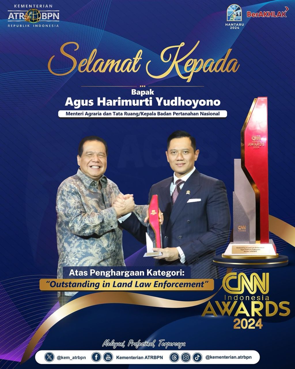 Segenap jajaran Kementerian ATR/BPN mengucapkan selamat kepada Menteri Agraria dan Tata Ruang/Kepala Badan Pertanahan Nasional (ATR/BPN), Agus Harimurti Yudhoyono (AHY) yang menerima CNN Awards untuk kategori “Outstanding in Land Law Enforcement”.