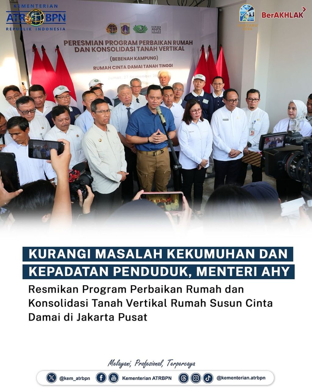 Menteri Agraria dan Tata Ruang/Kepala Badan Pertanahan Nasional (ATR/BPN), Agus Harimurti Yudhoyono (AHY) meresmikan Program Perbaikan Rumah dan Konsolidasi Tanah Vertikal Rumah Susun Cinta Damai. Program yang terealisasi atas kerja sama Kementerian ATR/BPN, Pemerintah Provinsi DKI Jakarta, dan Yayasan Buddha Tzu Chi Indonesia ini diluncurkan guna mengurangi permasalahan _backlog_ rumah hunian, kekumuhan, serta kepadatan warga di DKI Jakarta.