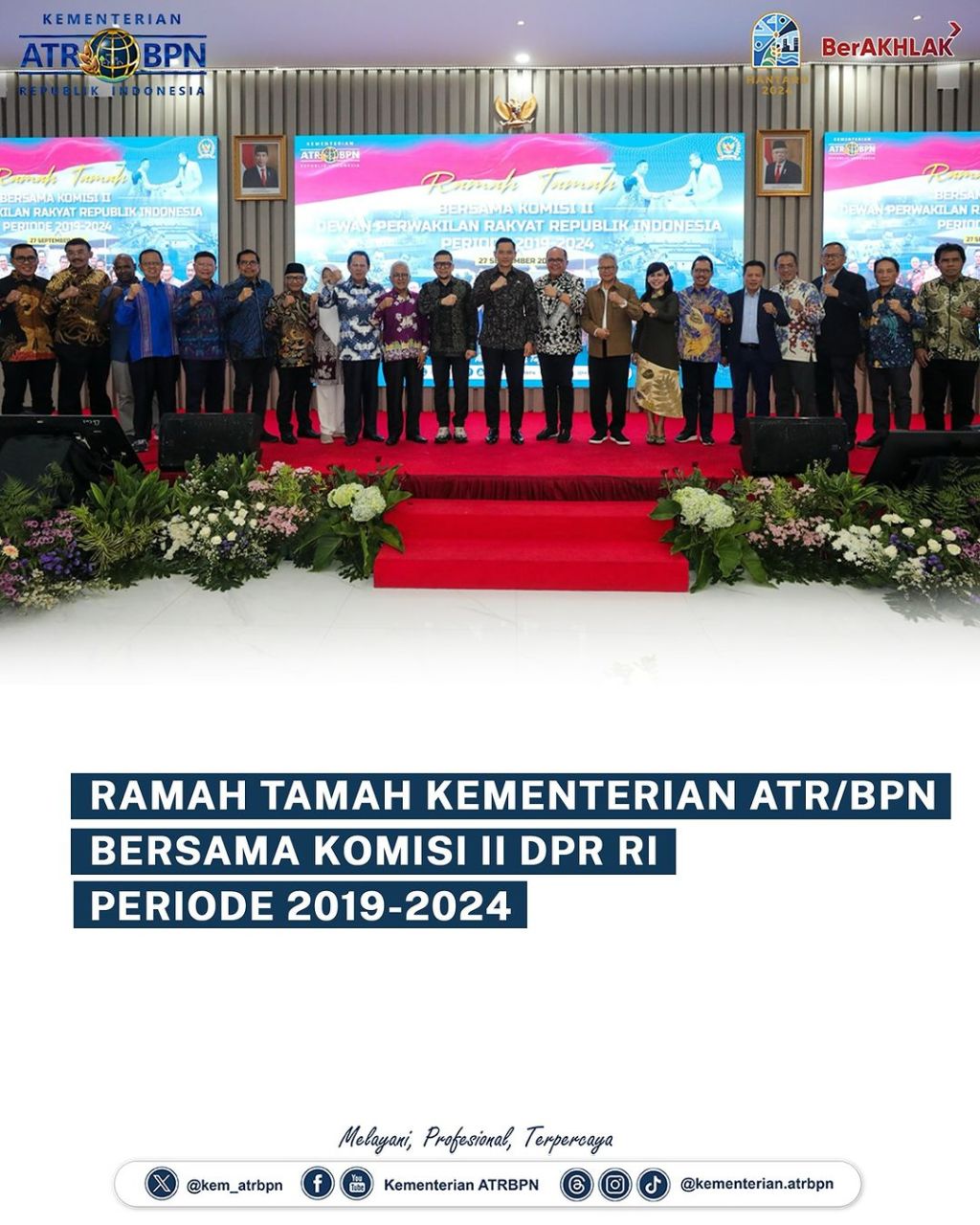 Kementerian Agraria dan Tata Ruang/Badan Pertanahan Nasional (ATR/BPN) menyelenggarakan Ramah Tamah bersama Komisi II Dewan Perwakilan Rakyat Republik Indonesia (DPR RI Periode 2019-2024 pada Jumat (27/09/2024) di Kementerian ATR/BPN, Jakarta. Dalam kegiatan ini, Menteri ATR/Kepala BPN, Agus Harimurti Yudhoyono (AHY) menyampaikan apresiasinya kepada seluruh Pimpinan dan Anggota Komisi II DPR RI atas dukungan yang diberikan ke Kementerian ATR/BPN, sehingga seluruh program dapat berjalan dengan lancar.