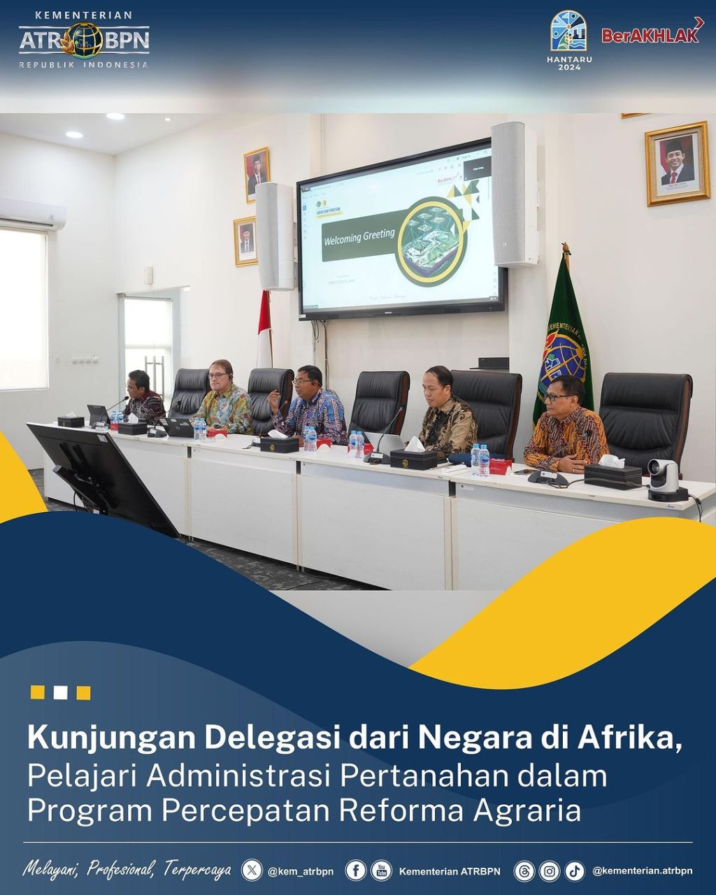 Delegasi dari Republik Senegal, Republik Madagaskar, dan Republik Pantai Gading mengunjungi Kementerian Agraria dan Tata Ruang/Badan Pertanahan Nasional (ATR/BPN) untuk mempelajari Program Percepatan Reforma Agraria (PPRA) yang berlangsung di Indonesia, Senin (30/09/2024). Kehadiran rombongan disambut langsung oleh Direktur Jenderal Survei dan Pemetaan Pertanahan dan Ruang (SPPR), Virgo Eresta Jaya yang membuka pembicaraan dengan mengenalkan informasi mendasar tentang Kementerian ATR/BPN.