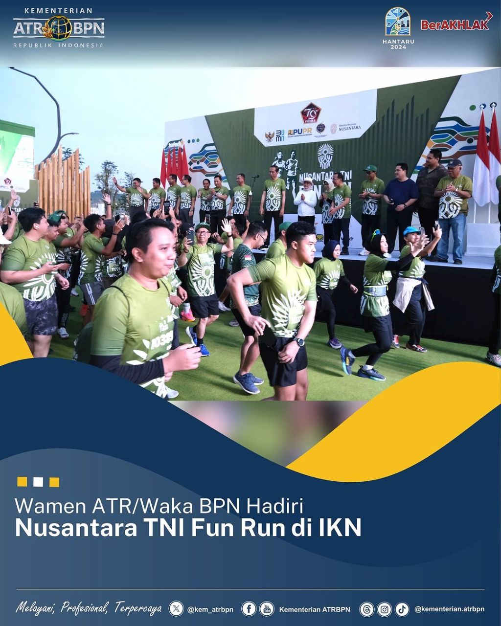 Wakil Menteri Agraria dan Tata Ruang/Wakil Kepala Badan Pertanahan Nasional (Wamen ATR/Waka BPN) sekaligus Plt. Wakil Kepala Otorita Ibu Kota Nusantara (OIKN), Raja Juli Antoni hadir dalam Nusantara TNI Fun Run pada Minggu (06/10/2024) di Ibu Kota Nusantara, Kalimantan Timur. Kegiatan ini resmi dibuka oleh Presiden Republik Indonesia (RI), Joko Widodo yang didampingi oleh Ibu Negara, Iriana Joko Widodo.