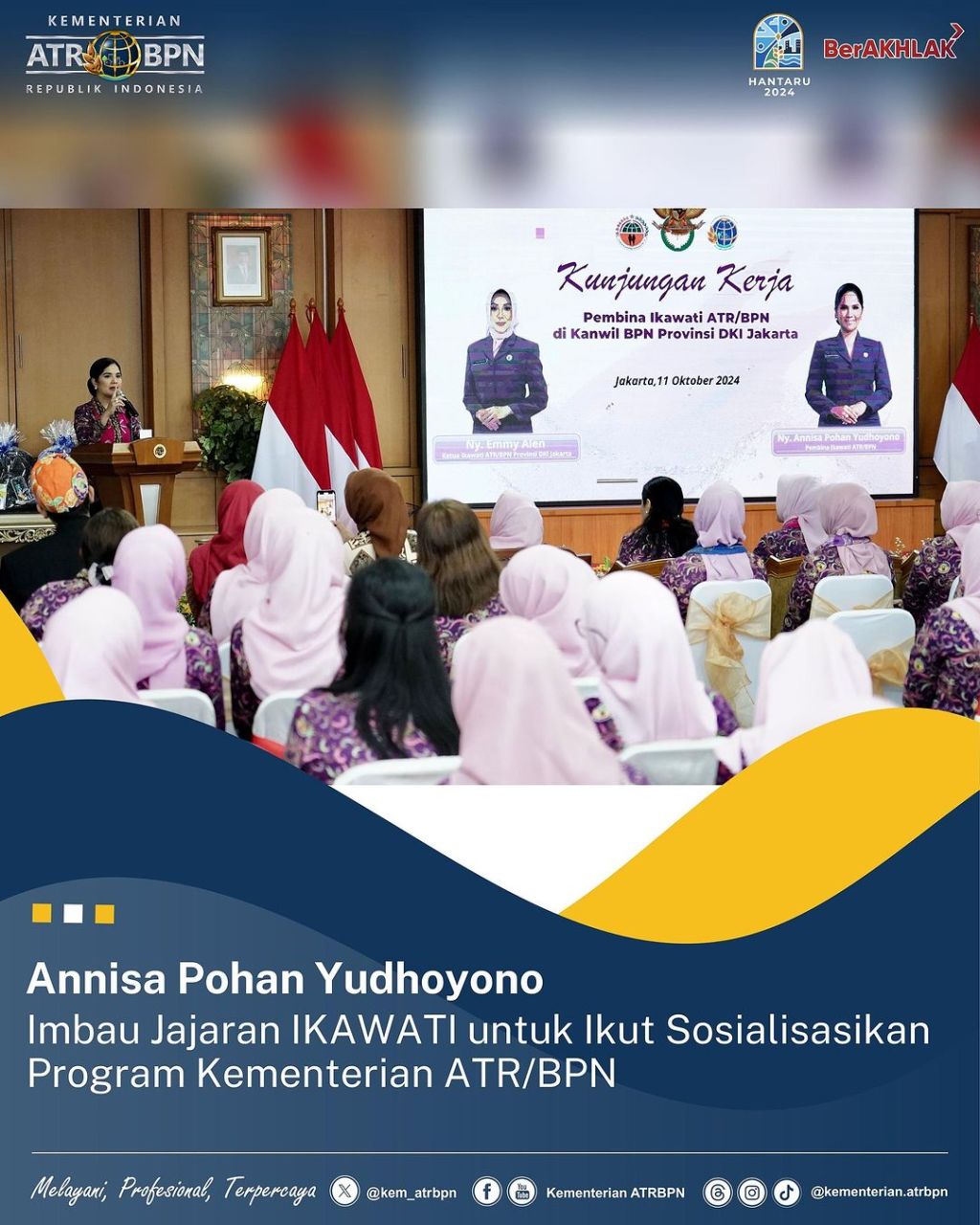 Ikatan Istri Karyawan dan Karyawati Kementerian Agraria dan Tata Ruang/Badan Pertanahan Nasional (IKAWATI ATR/BPN) mempunyai peran untuk turut serta menyosialisasikan program-program Kementerian ATR/BPN. Hal tersebut terus diimbau oleh Pembina IKAWATI ATR/BPN, Annisa Pohan Yudhoyono di setiap kunjungannya ke daerah, termasuk saat mengunjungi Kantor Wilayah (Kanwil) BPN Provinsi DKI Jakarta, Jumat (11/10/2024).