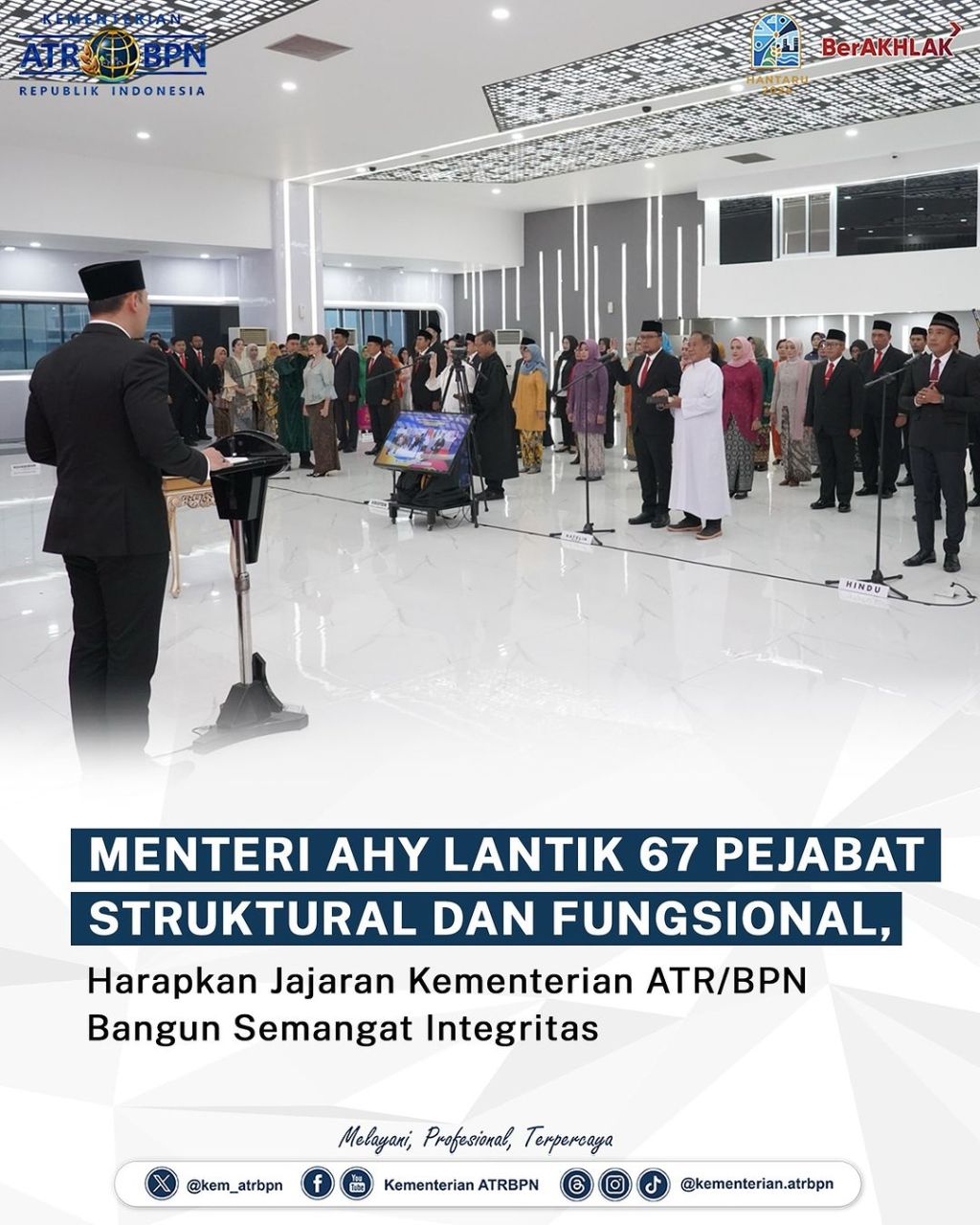 Menteri Agraria dan Tata Ruang/Kepala Badan Pertanahan Nasional (ATR/BPN), Agus Harimurti Yudhoyono (AHY) melantik 67 pejabat di lingkungan Kementerian ATR/BPN yang terdiri dari Pejabat Pimpinan Tinggi Madya dan Pratama serta Pejabat Administrator dan Fungsional. Pelantikan sekaligus Pengambilan Sumpah/Janji Jabatan Pejabat Struktural dan Fungsional ini berlangsung di Aula Prona, Kantor Kementerian ATR/BPN, Jakarta, Senin (14/10/2024).