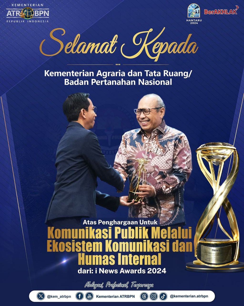 Kementerian ATR/BPN meraih penganugerahan atas Penghargaan untuk Komunikasi Publik Melalui Ekosistem Komunikasi dan Humas Internal oleh i News Awards 2024.