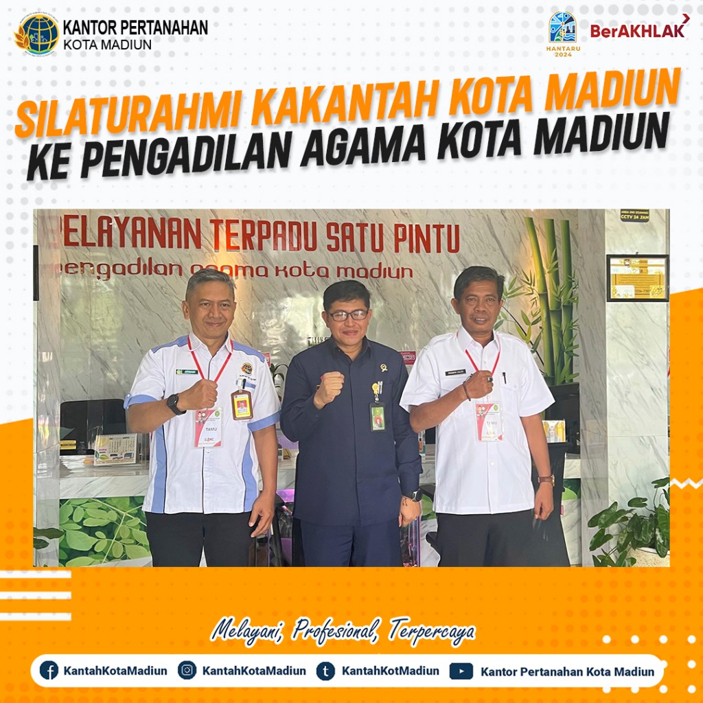 Rabu (16/10/2024) Kepala Kantor Pertanahan Kota Madiun, Bapak Triawan Saleh, S.T., M.Si. bersama dengan Kepala Seksi Penetapan Hak dan Pendaftaran, Bapak R. Rusmarjanto Atmadi, A.Ptnh., M.M. melaksanakan silaturahmi ke Pengadilan Agama Kota Madiun dan disambut hangat oleh Ketua Pengadilan Agama Kota Madiun, Bapak Dr. Sofyan Zefri, S.H.I., M.S.I.