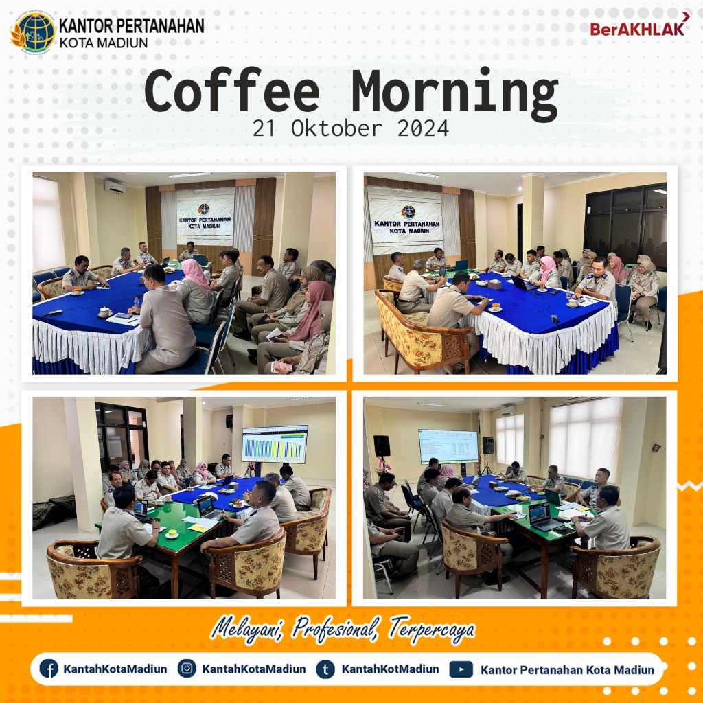 Halo #SobATRBPN, Hari ini Senin (21/10/2024) Kantor Pertanahan Kota Madiun melaksanakan Coffee Morning sekaligus Rapat Koordinasi. Pada Coffee Morning Kali ini Kantor Pertanahan Kota Madiun melakukan evaluasi kegiatan sepekan sebelumnya dan rencana kegiatan yang akan dilaksanakan dalam pekan depan.
