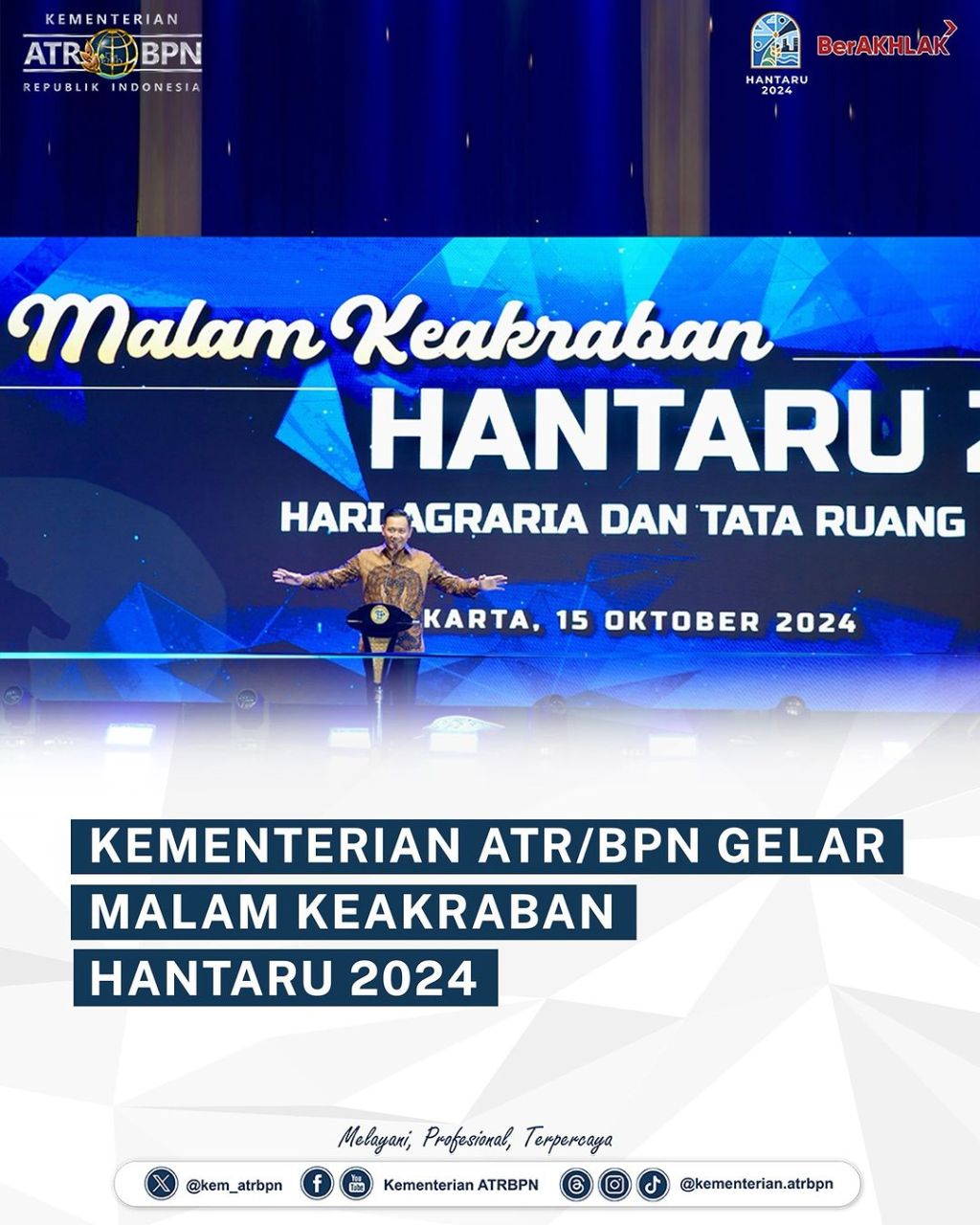 Menutup rangkaian peringatan Hari Agraria dan Tata Ruang (HANTARU) 2024, Kementerian Agraria dan Tata Ruang/Badan Pertanahan Nasional (ATR/BPN) melaksanakan Malam Keakraban (Makrab) di The Tribrata Convention Center, Jakarta pada Selasa (15/10/2024). Menteri ATR/Kepala BPN, Agus Harimurti Yudhoyono (AHY) mengungkapkan bahwa Makrab HANTARU 2024 ini seolah mewakili kehangatan semenjak ia menjabat pada bulan Februari lalu.