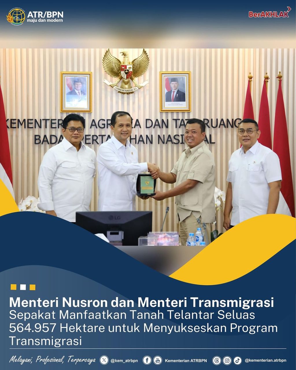 “Kami butuh kerja sama dengan lembaga apa pun yang bisa memanfaatkan tanah-tanah telantar supaya tanah tersebut mempunyai nilai ekonomi. Kebetulan hari ini datang pemanfaatannya dari transmigrasi. Jadi gayung bersambut, beliau punya program dan akan mendatangkan orang untuk memanfaatkan tanah tersebut,” ujar Menteri Nusron.