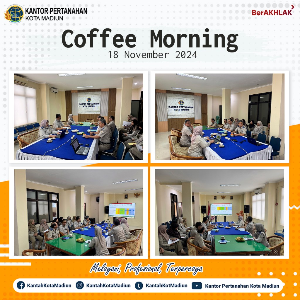 Halo #SobATRBPN, Hari ini Senin (18/11/2024) Kantor Pertanahan Kota Madiun melaksanakan Coffee Morning sekaligus Rapat Koordinasi. Pada Coffee Morning Kali ini Kantor Pertanahan Kota Madiun melakukan evaluasi kegiatan sepekan sebelumnya dan rencana kegiatan yang akan dilaksanakan dalam pekan depan.