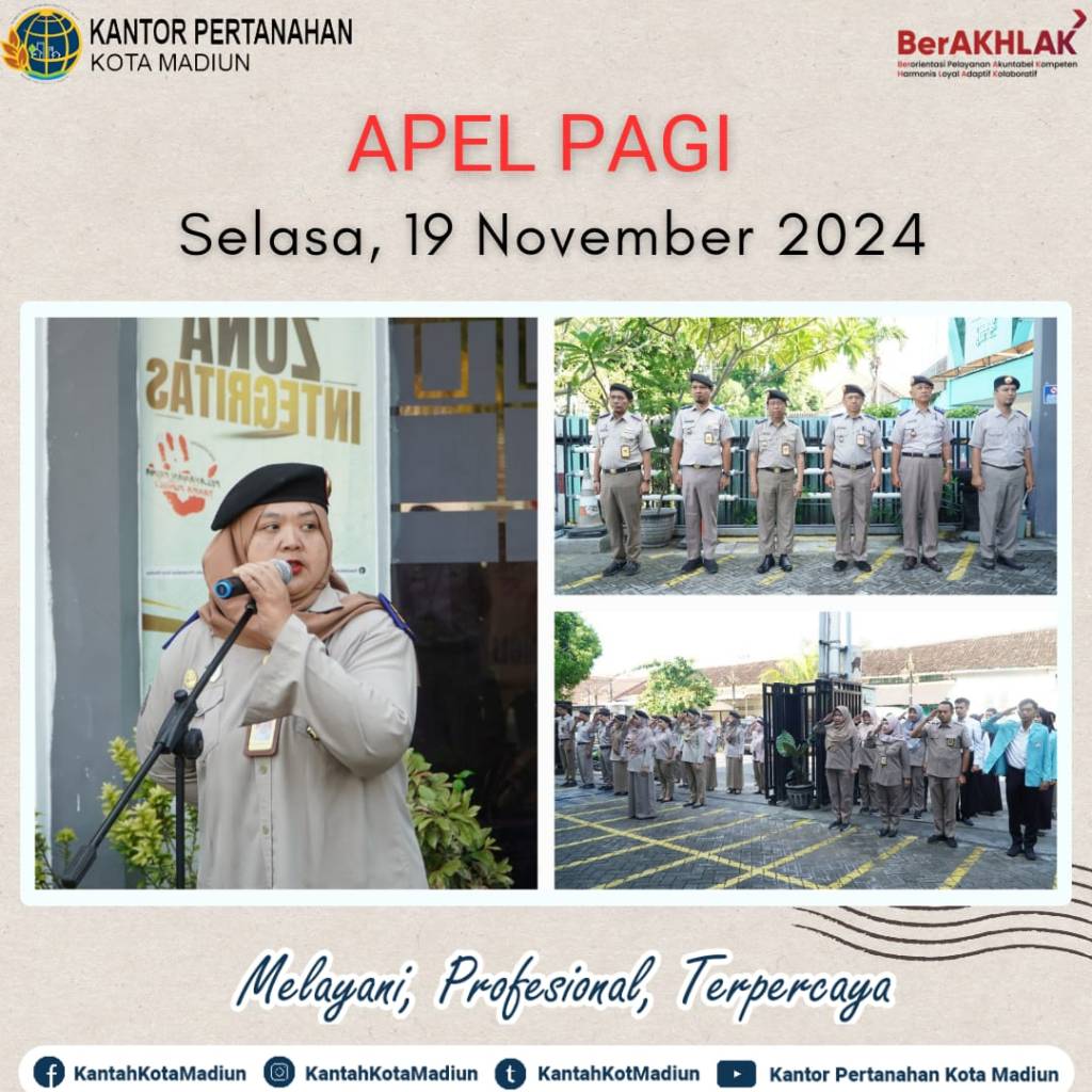 Halo #SobATRBPN, Hari ini Selasa (19/11/2024) Kantor Pertanahan Kota Madiun melaksanakan Apel Pagi yang bertempat di Halaman Depan Kantor Pertanahan Kota Madiun. Yang bertindak sebagai Pembina Upacara, Kepala Sub Bagian Tata Usaha, Ibu Rieke Retno Handayani, S.E., M.Si. dan diikuti oleh seluruh Pejabat Pengawas dan Jajaran Kantor Pertanahan Kota Madiun.
