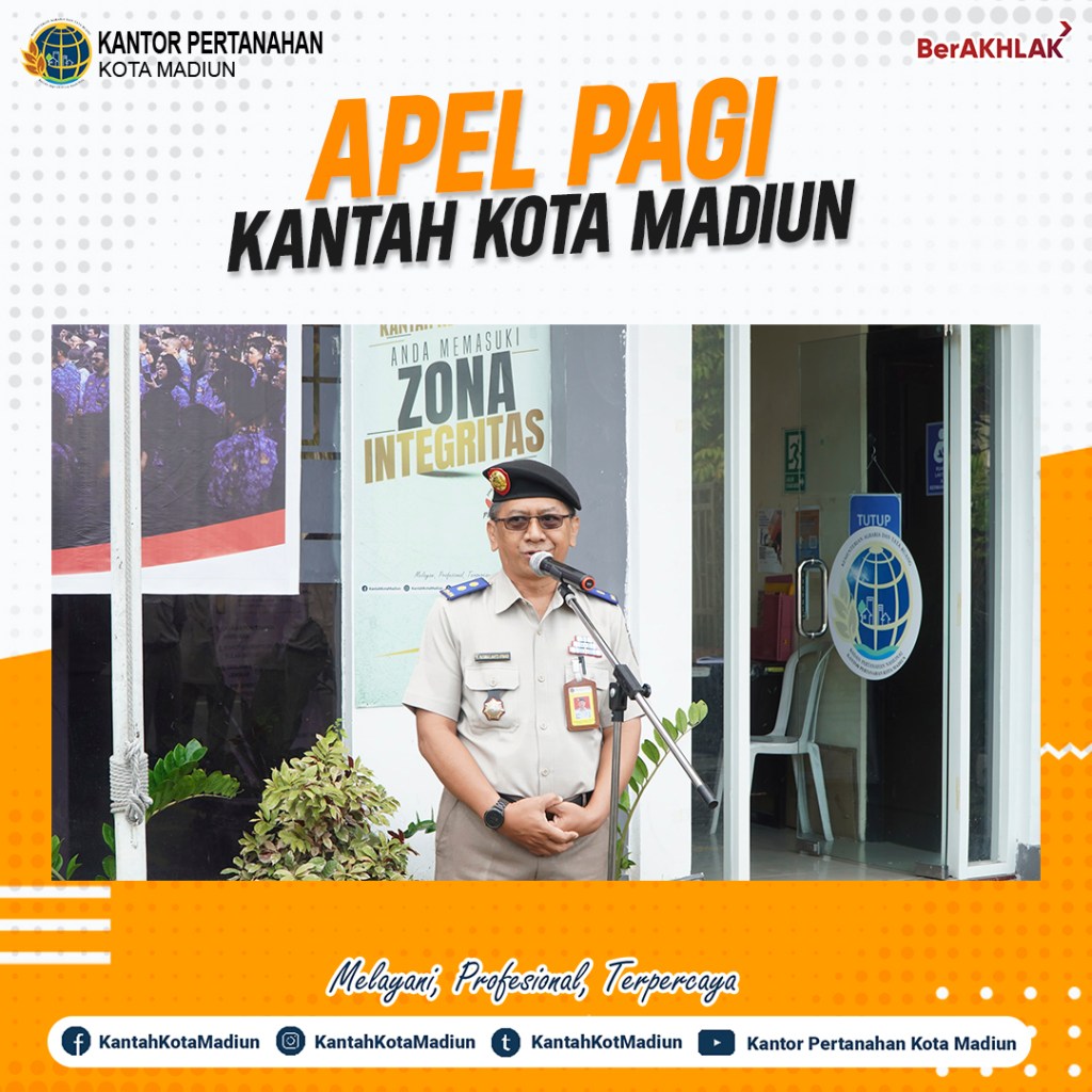 Halo #SobATRBPN, Hari ini Selasa (03//12/2024) Kantor Pertanahan Kota Madiun melaksanakan Apel Pagi yang bertempat di Halaman Depan Kantor Pertanahan Kota Madiun. Yang bertindak sebagai Pembina Upacara, Kepala Seksi Penetapan Hak dan Pendaftaran, R. Rusmarjanto Atmadi, A.Ptnh., M.M. dan diikuti oleh seluruh Pejabat Pengawas dan Jajaran Kantor Pertanahan Kota Madiun.