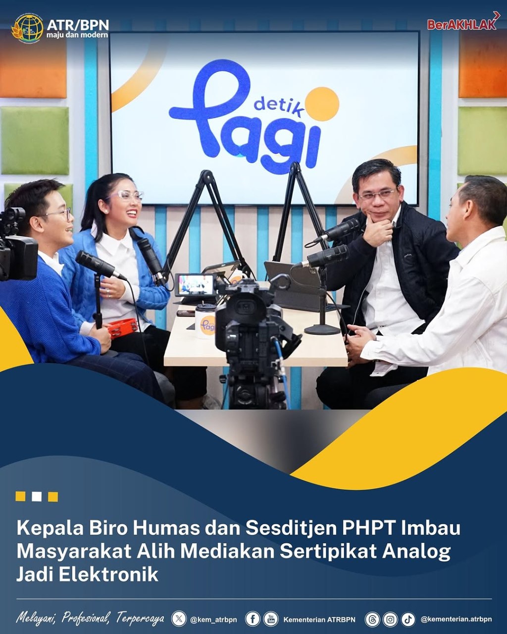 “Sertipikat yang warna hijau (sertipikat analog, red) itu masih berlaku sampai nanti masyarakat mau mengalihmediakan, kita akan layani. Dengan Sertipikat Elektronik, kalau terkena musibah kebakaran, banjir, tidak masalah, bisa print lagi di Kantor Pertanahan karena pangkalan datanya itu ada di kantor,” ujar Harison Mocodompis dalam wawancara bersama Detik Pagi di Gedung Trans Digital Media, Jakarta, Rabu (04/11/2024).