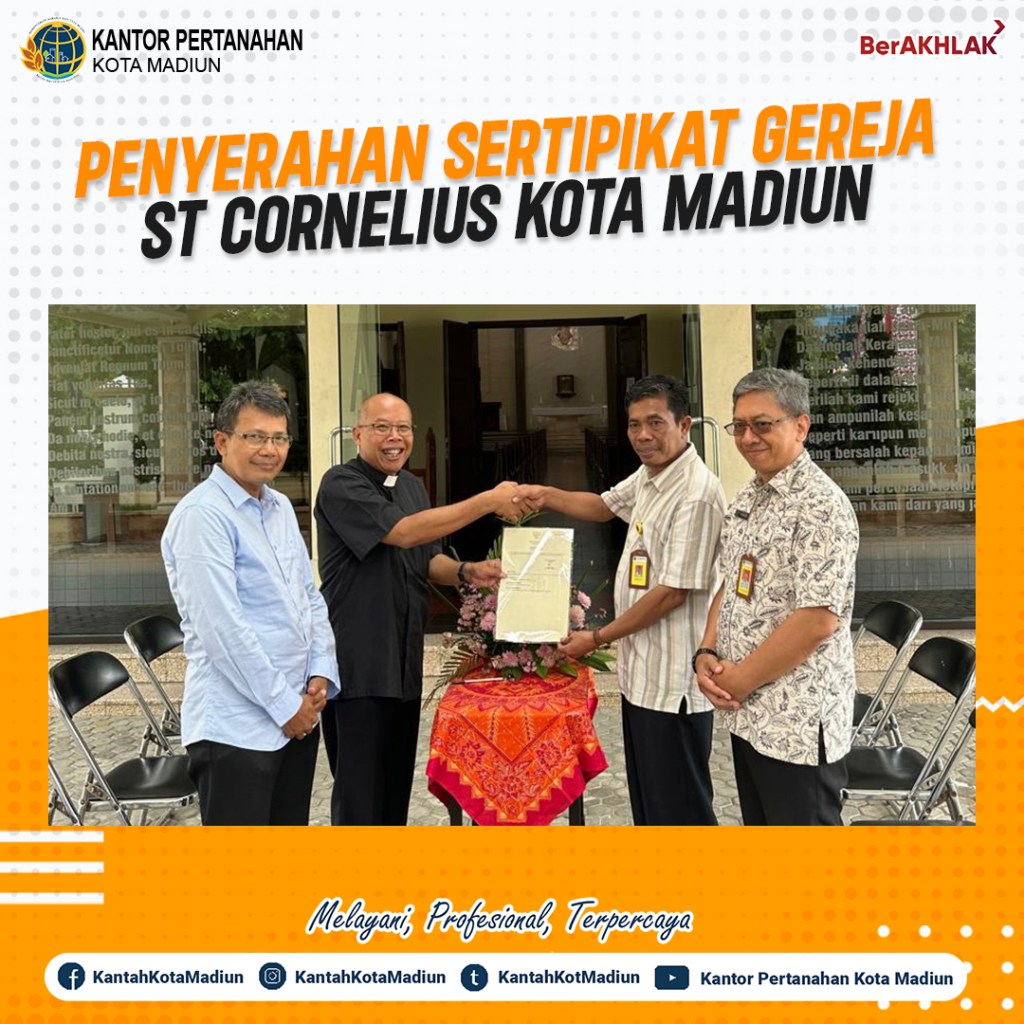 Halo #SobATRBPN, Hari ini Jumat (06/12/2024) Kantor Pertanahan Kota Madiun melakukan penyerahan sertipikat Gereja St. Cornelius Kota Madiun. Turut hadir Kepala Kantor Pertanahan Kota Madiun, Bapak Triawan Saleh, S.T., M.Si. dan ditemani oleh Kepala Seksi Penetapan Hak dan Pendaftaran, Bapak R. Rusmarjanto Atmadi, A.Ptnh., M.M.