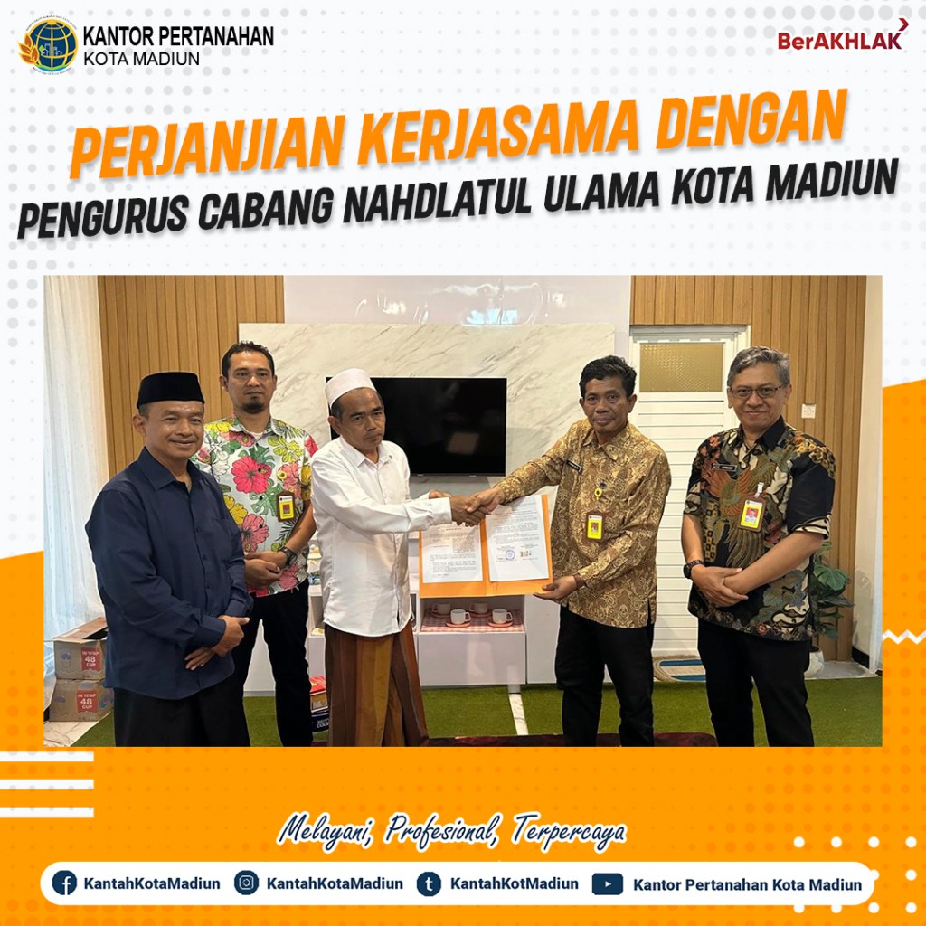 Halo #SobATRBPN, Kamis (06/12/2024) Kantor Pertanahan Kota Madiun melaksanakan Perjanjian Kerjasama MoU dengan Pengurus Cabang Nahdlatul Ulama (PCNU) Kota Madiun. Turut hadir Kepala Kantor Pertanahan Kota Madiun, Bapak Triawan Saleh, S.T., M.Si. beserta dengan Kepala Seksi Penetapan Hak dan Pendaftaran dan Kepala Seksi Survei dan Pemetaan Kantor Pertanahan Kota Madiun.