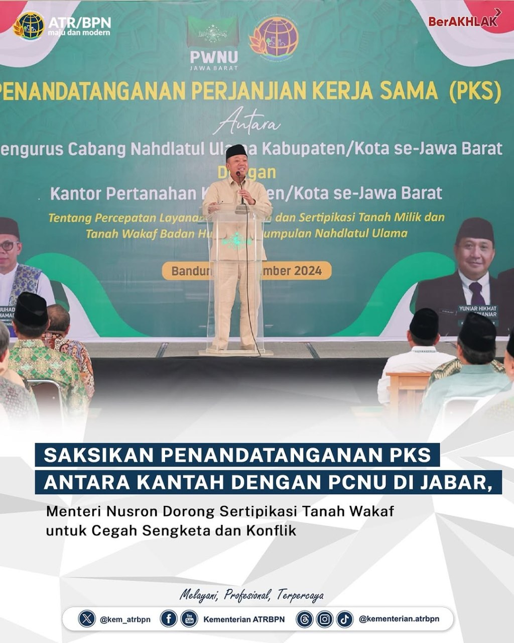 “Memang (sertipikasi tanah wakaf, red) ini dianjurkan, jadi kalau ada pesantren yang belum bersertipikat langsung didaftarkan saja sehingga tidak ada konflik,” ucap Nusron Wahid usai menyaksikan penandatanganan Perjanjian Kerja Sama (PKS) antara 25 Kantor Pertanahan (Kantah) Kabupaten/Kota se-Jawa Barat dengan Pengurus Cabang Nahdlatul Ulama (PCNU) di wilayah terkait, yang berlangsung di Kantor PWNU Jawa Barat, Bandung, Kamis (05/12/2024).