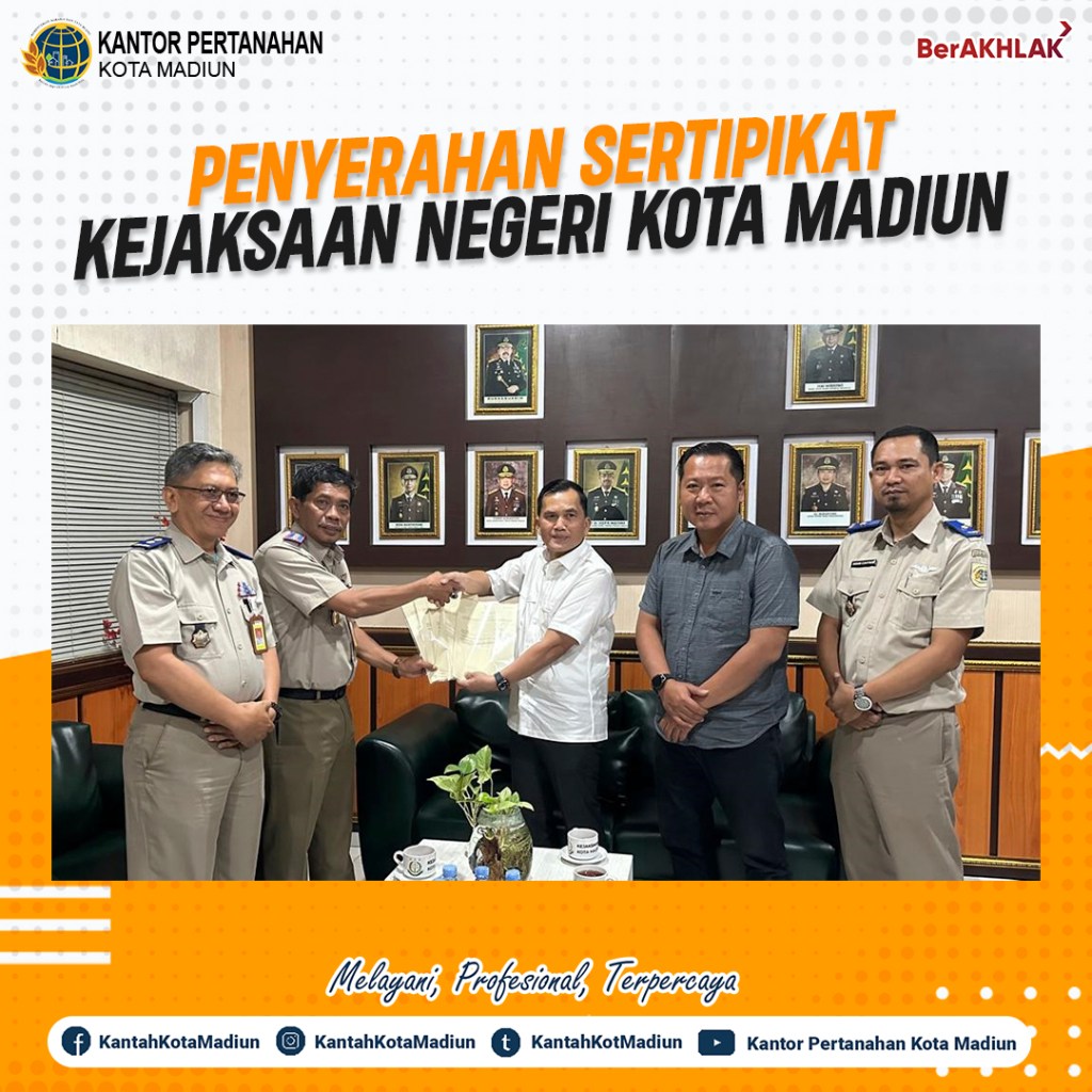 Halo #SobATRBPN, Selasa (10/12/2024) Kantor Pertanahan Kota Madiun melaksanakan penyerahan sertipikat Kejaksaan Negeri Kota Madiun yang diserahkan langsung oleh Kepala Kantor Pertanahan Kota Madiun, Bapak Triawan Saleh, S.T., M.Si., dan diterima langsung oleh Kepala Kejaksaan Negeri Kota Madiun, Bapak Dede Sutisna, S.H., M.H.