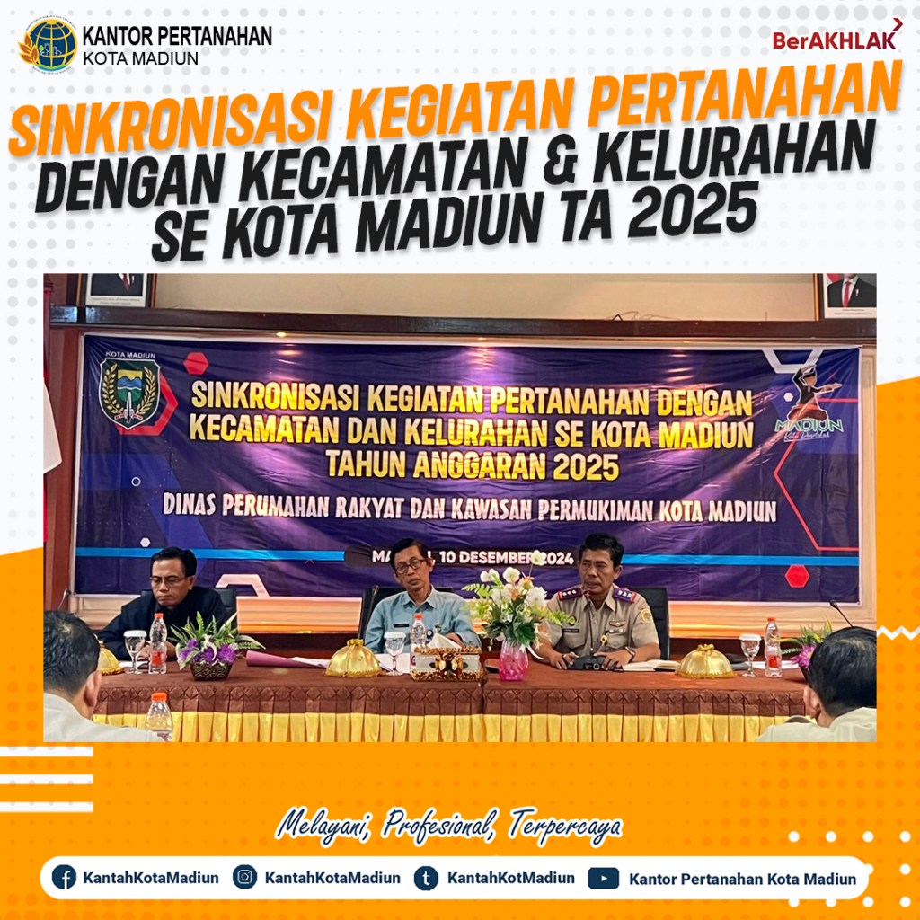 Halo #SobATRBPN, Hari ini Selasa (10/12/2024) Kantor Pertanahan Kota Madiun mengikuti sinkronisasi kegiatan pertanahan dengan Kecamatan dan Kelurahan Se-Kota Madiun Tahun Anggaran 2024 yang diadakan oleh Dinas Perumahan Rakyat dan Kawasan Permukiman Kota Madiun. Turut hadir Kepala Kantor Pertanahan Kota Madiun, Bapak Triawan Saleh, S.T., M.Si. yang bertindak sebagai narasumber pada acara kali ini.