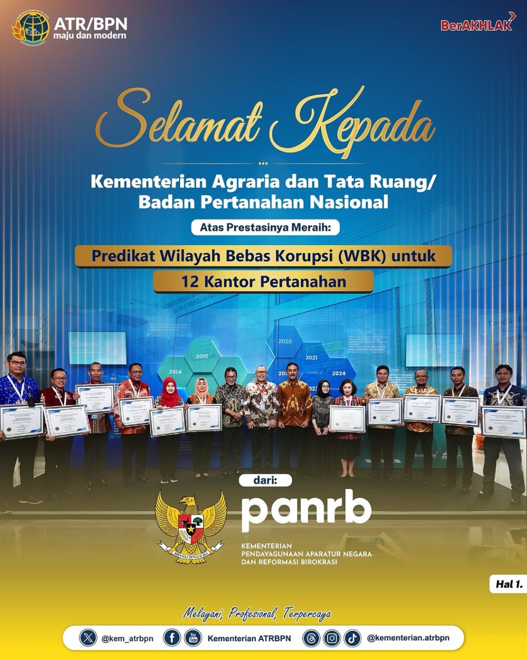Selamat kepada Kementerian ATR/BPN atas diraihnya Predikat Wilayah Bebas Korupsi untuk 12 Kantor Pertanahan dari Kementerian Pendayagunaan Aparatur Negara dan Reformasi Birokrasi.
