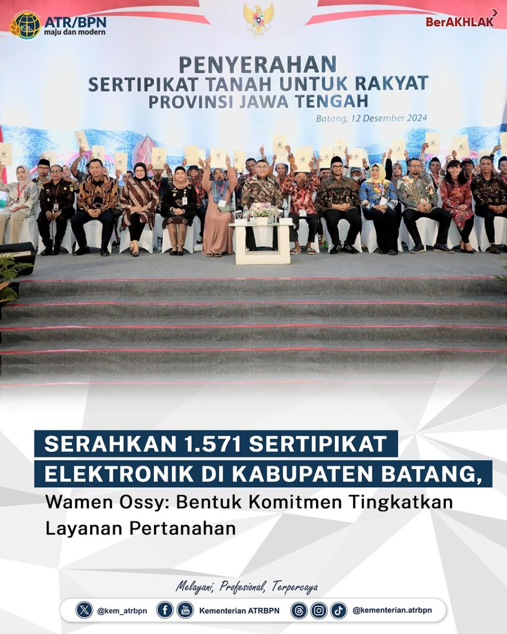 Wakil Menteri Agraria dan Tata Ruang/Wakil Kepala Badan Pertanahan Nasional (Wamen ATR/Waka BPN), Ossy Dermawan menyerahkan 1.571 Sertipikat Elektronik di Gelanggang Olahraga (GOR) Abirawa, Kabupaten Batang, Provinsi Jawa Tengah pada Kamis (12/12/2024). Sertipikat Elektronik ini menjadi bentuk komitmen Kementerian ATR/BPN dalam meningkatkan kualitas pelayanan pertanahan melalui transformasi digital.