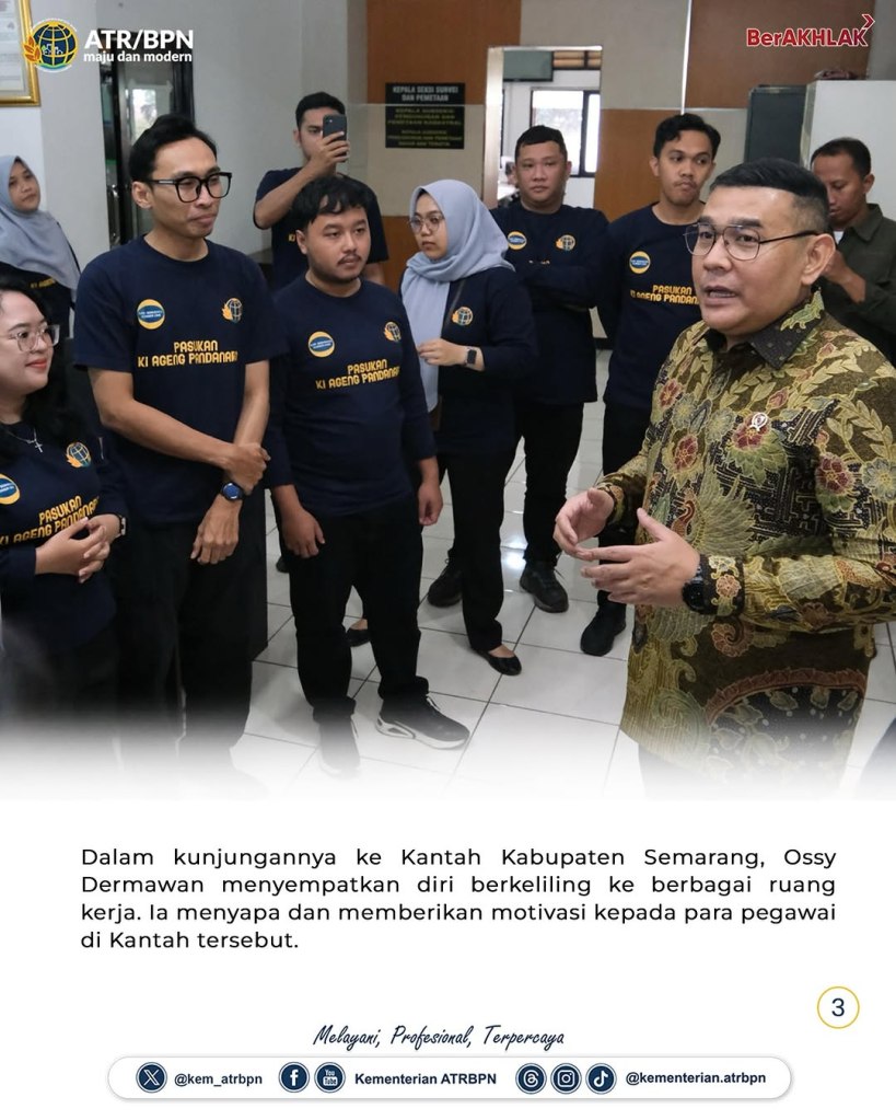 “Pelayanan yang cepat harus tetap mengedepankan ketelitian dan kehati-hatian, karena produk yang dikeluarkan Kementerian ATR/BPN memiliki kekuatan hukum tetap. Oleh karena itu, selain mempercepat waktu pelayanan, pegawai juga harus semakin teliti, akuntabel, dan mempertimbangkan manajemen risiko,” ujar Ossy Dermawan saat berkunjung ke Kantor Pertanahan (Kantah) Kabupaten Semarang pada Jumat (03/01/2025).