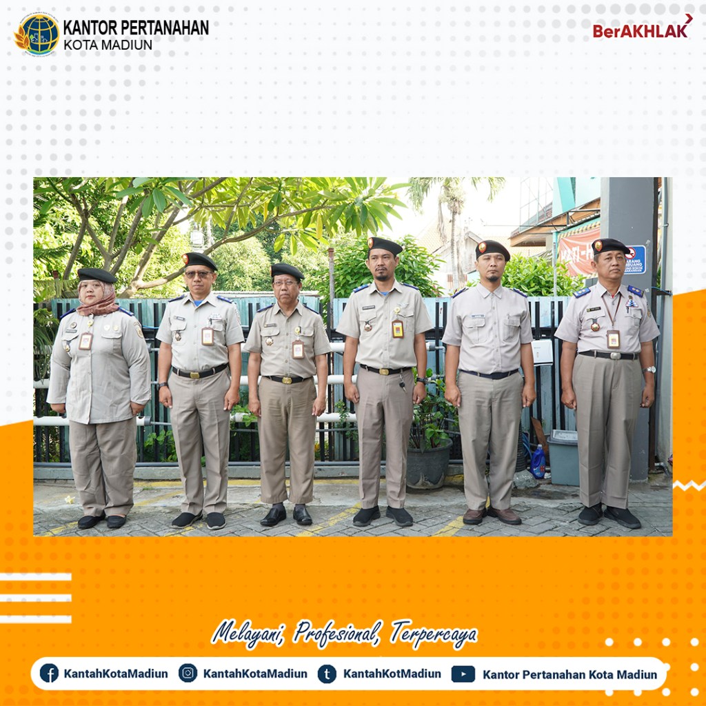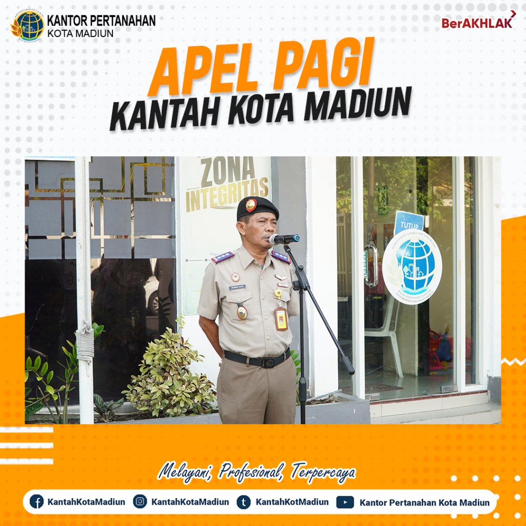 Halo #SobATRBPN, Hari ini Selasa (14/01/2025) Kantor Pertanahan Kota Madiun melaksanakan Apel Pagi yang bertempat di Halaman Depan Kantor Pertanahan Kota Madiun. Yang bertindak sebagai Pembina Upacara, Kepala Kantor Pertanahan Kota Madiun, Bapak Triawan Saleh, S.T., M.Si. dan diikuti oleh seluruh Pejabat Pengawas dan Jajaran Kantor Pertanahan Kota Madiun.