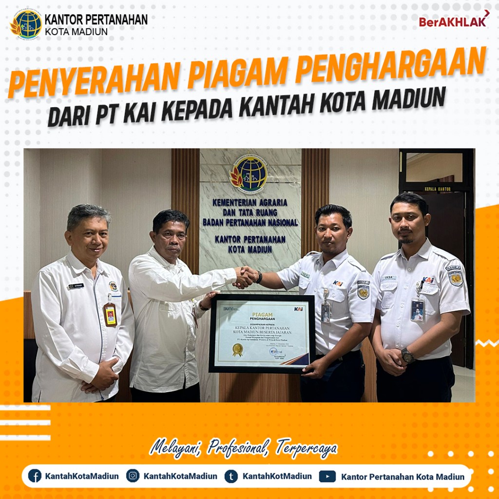 Halo #SobATRBPN, Hari ini Rabu (15/01/2025) Kantor Pertanahan Kota Madiun mendapat kunjungan dari PT Kereta Api Indonesia (KAI). Disambut hangat oleh Kepala Kantor Pertanahan Kota Madiun, Bapak Triawan Saleh, S.T., M.Si., serta penyerahan piagam penghargaan dari PT KAI kepada Kantor Pertanahan Kota Madiun.