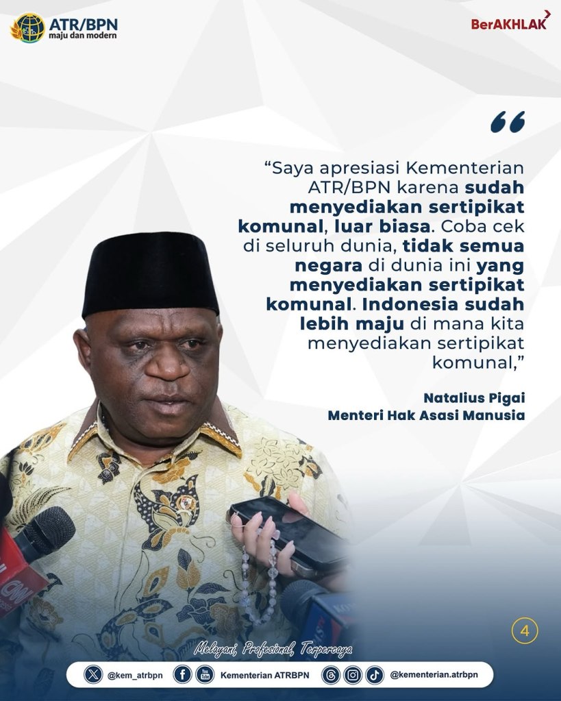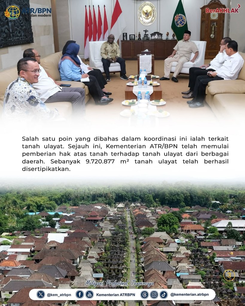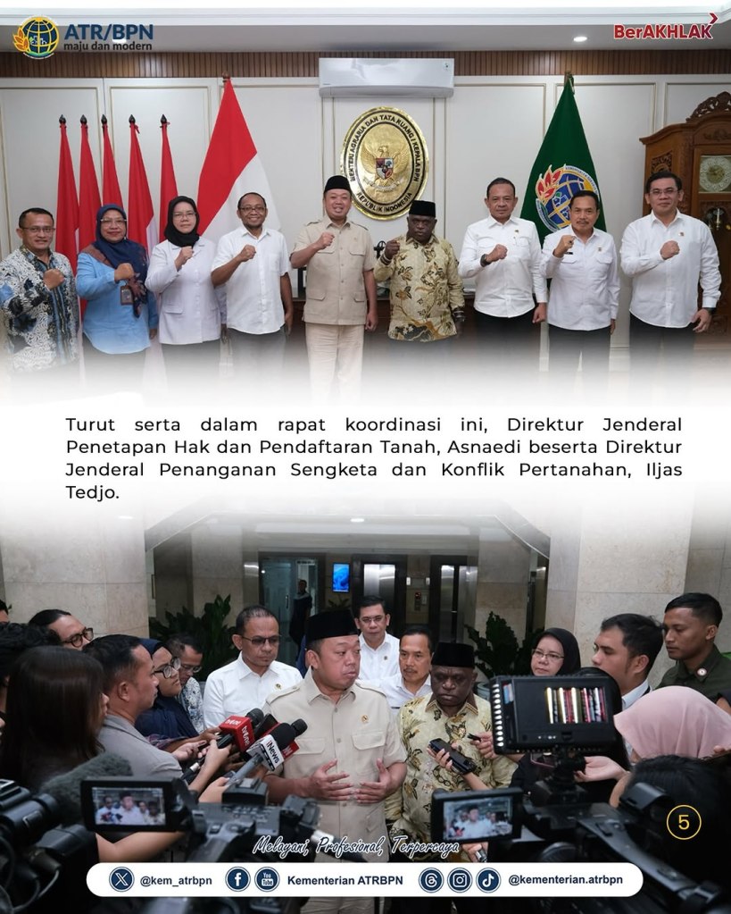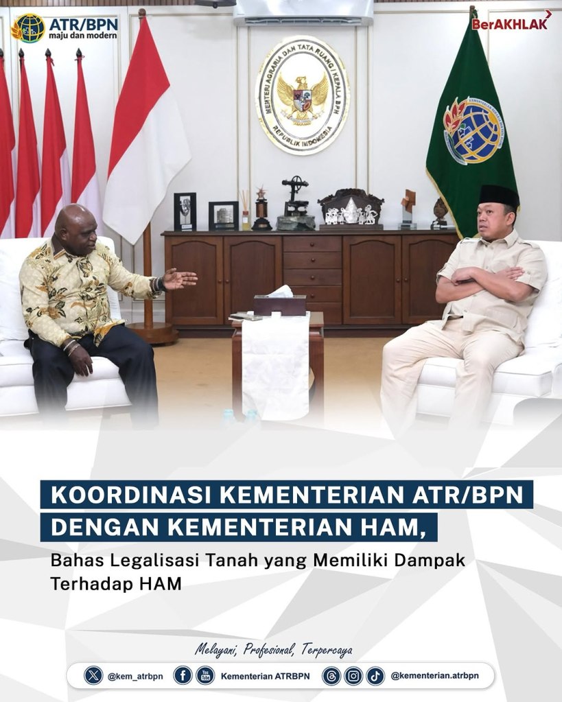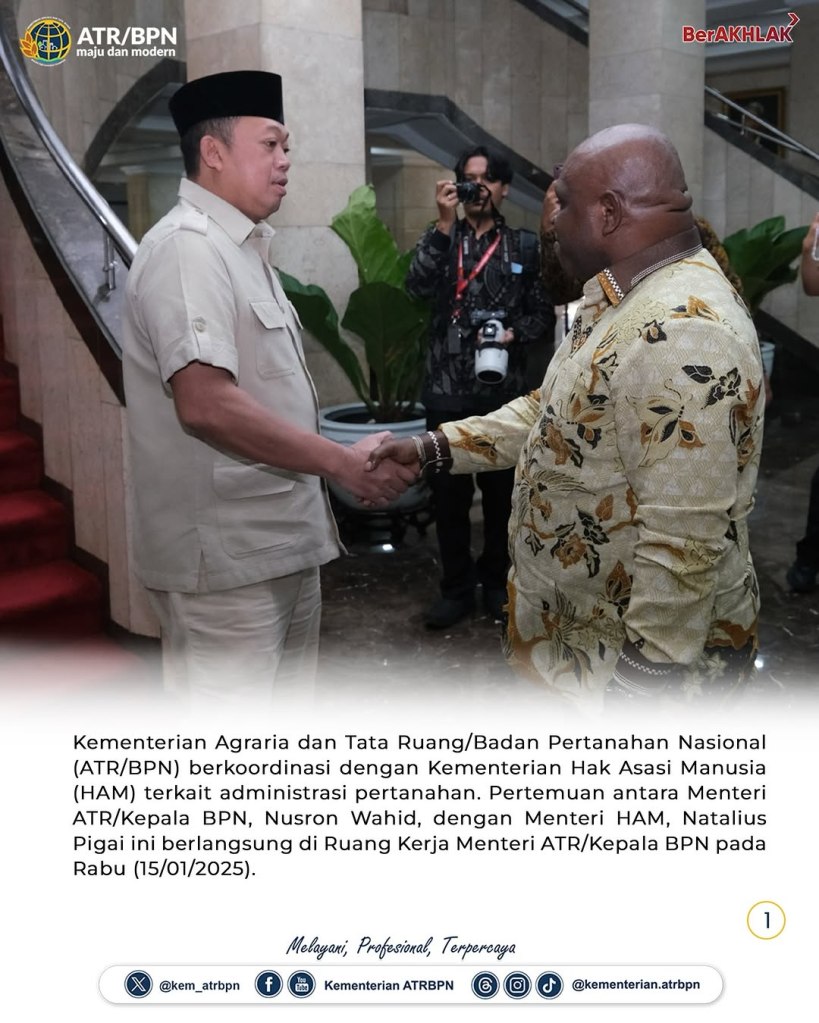 Kementerian Agraria dan Tata Ruang/Badan Pertanahan Nasional (ATR/BPN) berkoordinasi dengan Kementerian Hak Asasi Manusia (HAM) terkait administrasi pertanahan. Pertemuan antara Menteri ATR/Kepala BPN, Nusron Wahid, dengan Menteri HAM, Natalius Pigai ini berlangsung di Ruang Kerja Menteri ATR/Kepala BPN pada Rabu (15/01/2025).