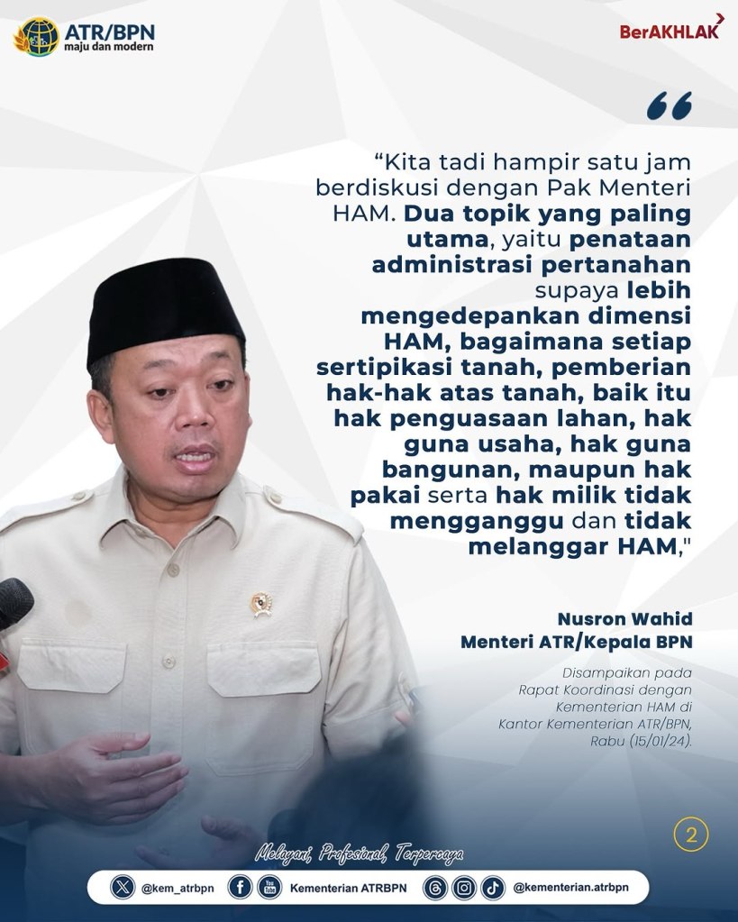 “Kita tadi hampir satu jam berdiskusi dengan Pak Menteri HAM. Dua topik yang paling utama, yaitu penataan administrasi pertanahan supaya lebih mengedepankan dimensi HAM, bagaimana setiap sertipikasi tanah, pemberian hak-hak atas tanah, baik itu hak penguasaan lahan, hak guna usaha, hak guna bangunan, maupun hak pakai serta hak milik tidak mengganggu dan tidak melanggar HAM,” kata Menteri Nusron kepada awak media selepas pertemuan berlangsung.