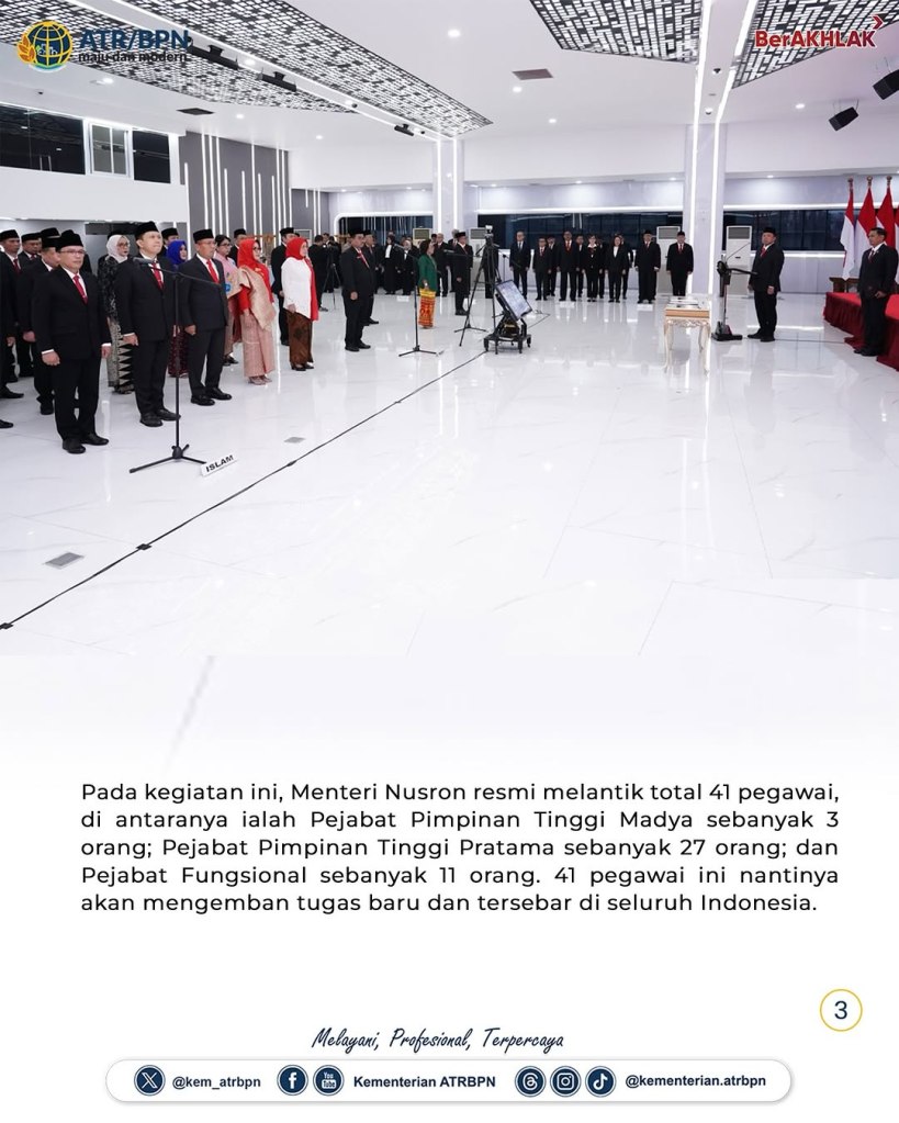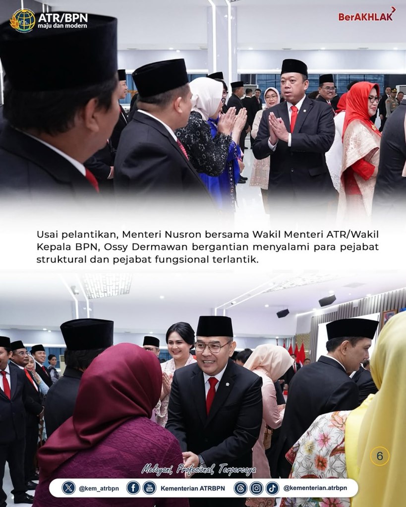 Kementerian Agraria dan Tata Ruang/Badan Pertanahan Nasional (ATR/BPN) menyelenggarakan Pelantikan dan Pengambilan Sumpah/Janji Jabatan Struktural dan Fungsional di lingkungan Kementerian ATR/BPN pada Senin (20/01/2025). Dalam sambutannya, Menteri ATR/Kepala BPN, Nusron Wahid menegaskan kepada jajaran yang dilantik untuk melaksanakan amanat jabatan dengan sebaik-baiknya.