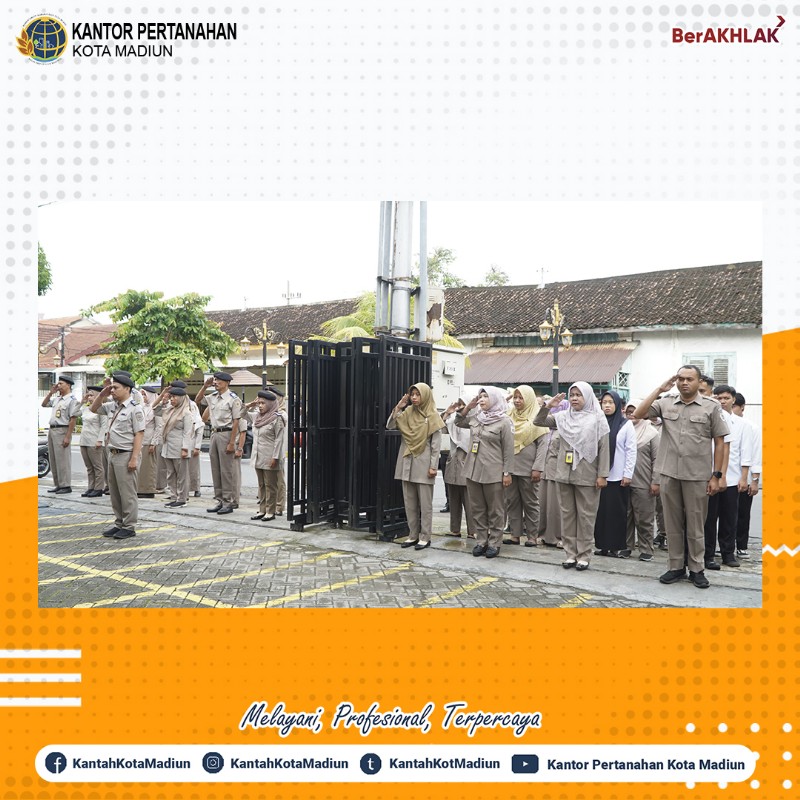 Halo #SobATRBPN, Hari ini Selasa (21/01/2025) Kantor Pertanahan Kota Madiun melaksanakan Apel Pagi yang bertempat di Halaman Depan Kantor Pertanahan Kota Madiun. Yang bertindak sebagai Pembina Upacara, Kepala Sub Bagian Tata Usaha, Ibu Rieke Retno Handayani, S.E., M.Si. dan diikuti oleh seluruh Pejabat Pengawas dan Jajaran Kantor Pertanahan Kota Madiun.