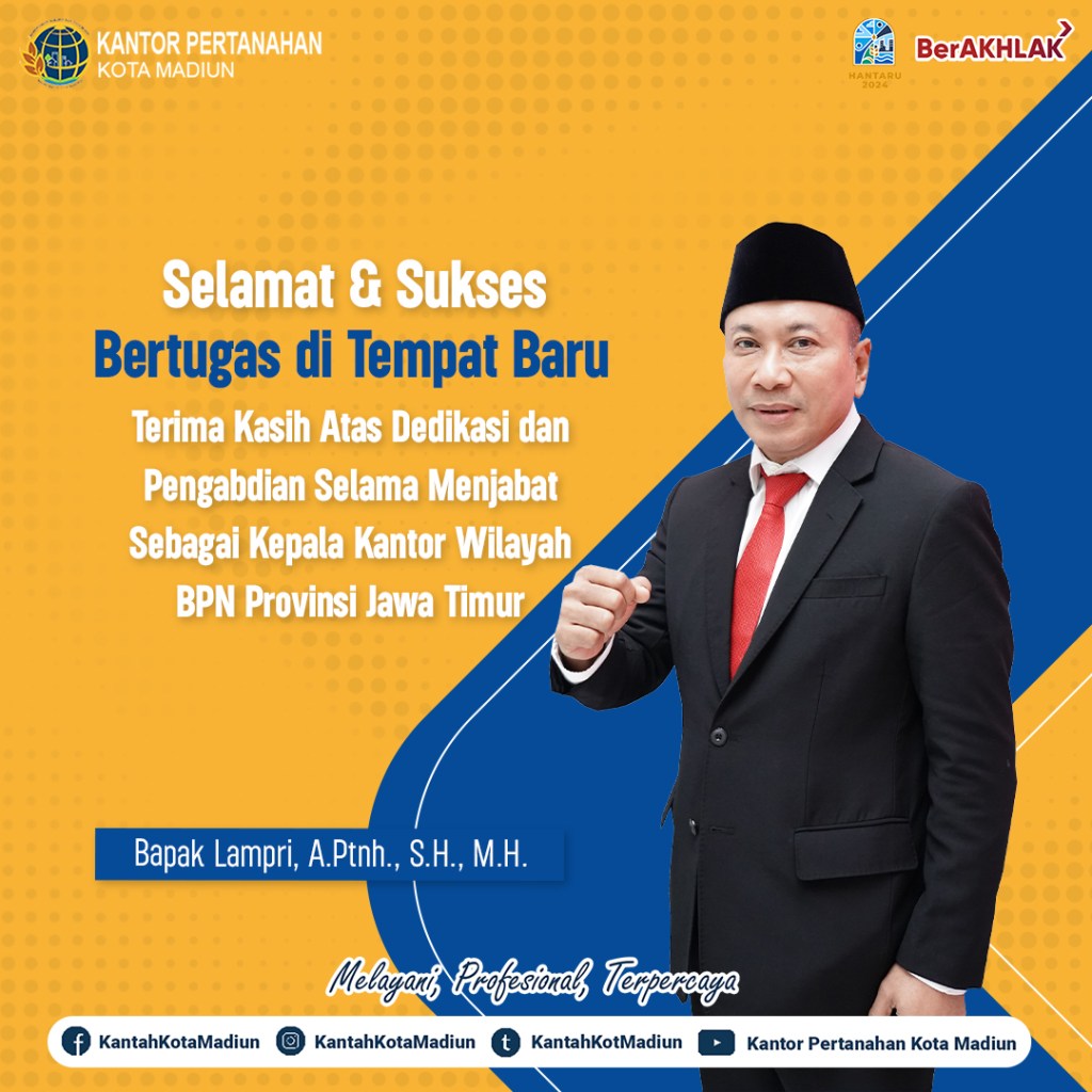 Segenap Jajaran Kantor Pertanahan Kota Madiun mengucapkan Terima Kasih atas dedikasi dan pengabdian Bapak Lampri, A.Ptnh., S.H., M.H. selama menjabat sebagai Kepala Kantor Wilayah BPN Provinsi Jawa Timur.