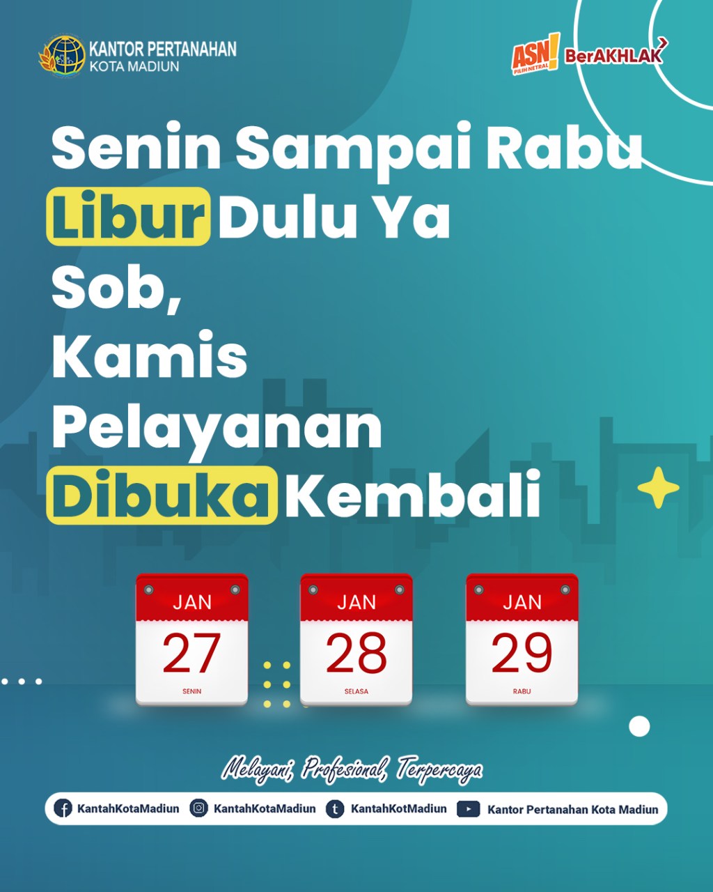 PENGUMUMAN! Sehubungan dengan Hari Libur Nasional Memperingati Isra Mikraj Nabi Muhammad S.A.W. dan Tahun Baru Imlek 2576 Kongzili, maka pelayanan pada Kantor Pertanahan Kota Madiun tutup mulai dari Senin, 27 s.d. 29 Januari 2025, dan dibuka kembali pada Kamis, 30 Januari 2025.