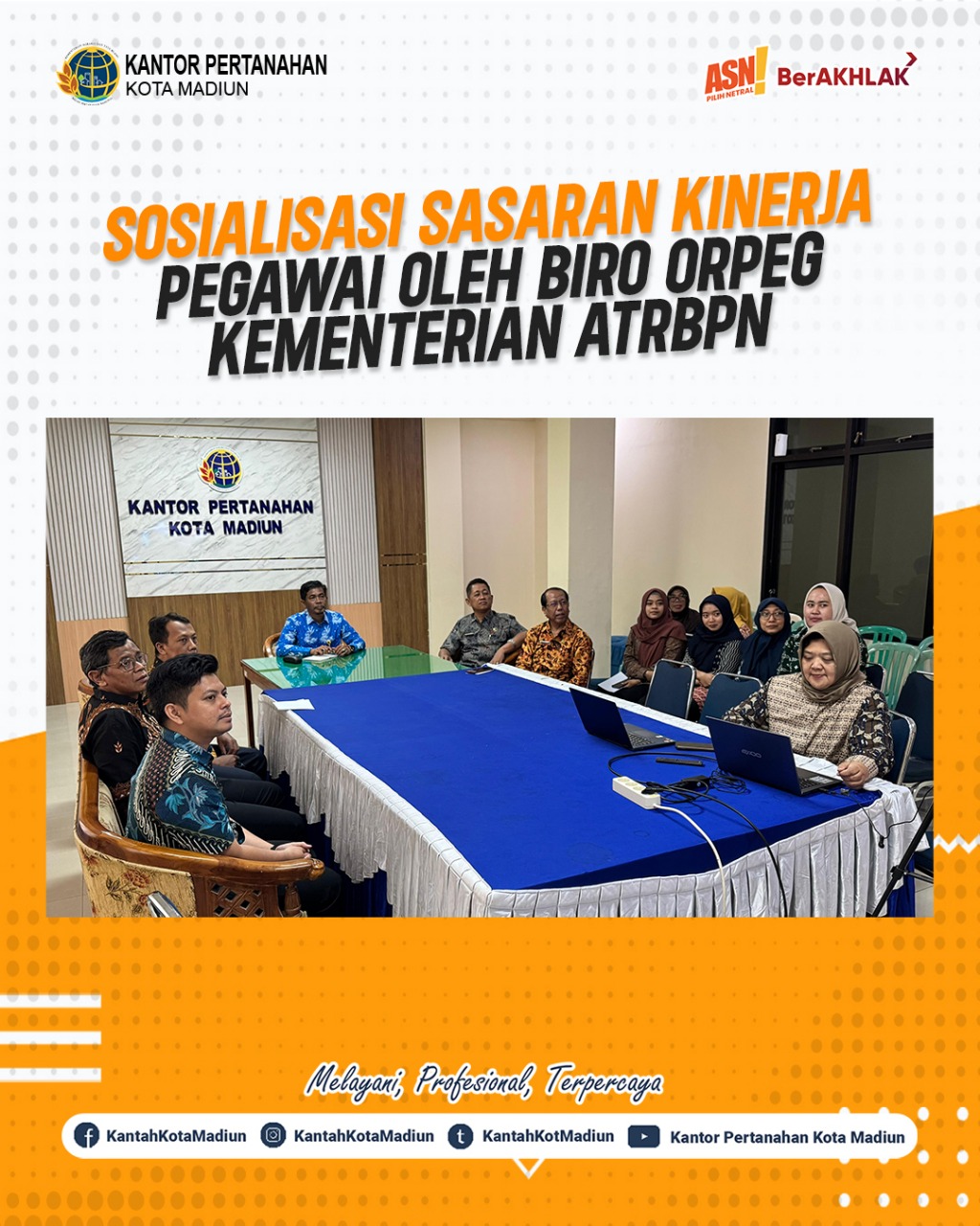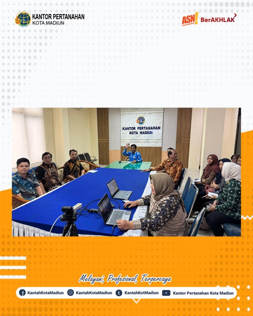 Halo #SobATRBPN, Hari ini Kamis (30/01/2025) Kantor Pertanahan Kota Madiun mengikuti Sosialisasi Sasaran Kinerja Pegawai (SKP) dengan narasumber dari Biro Orpeg Kementerian ATR/BPN.