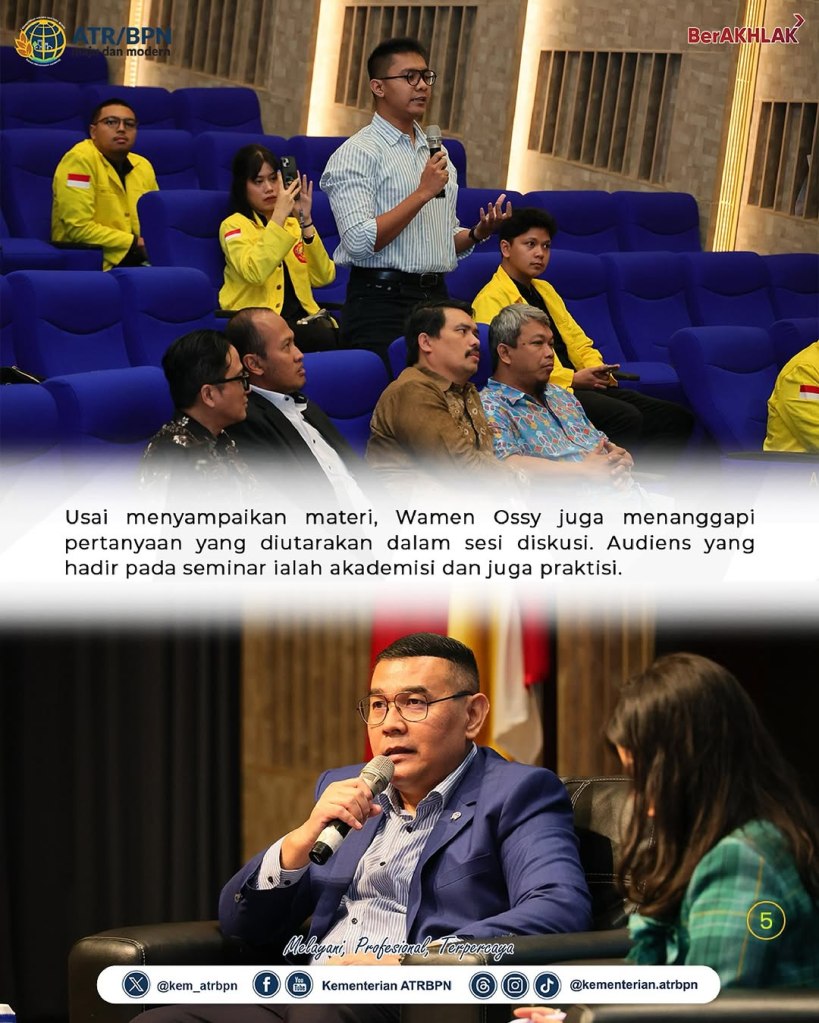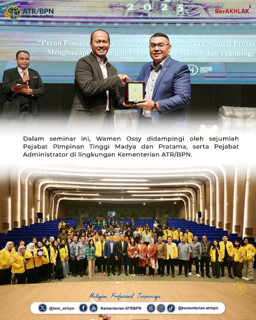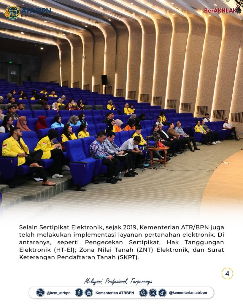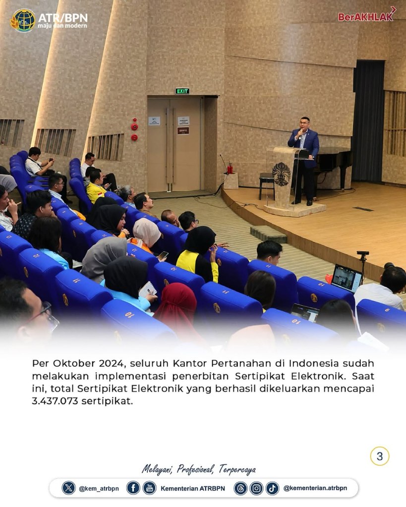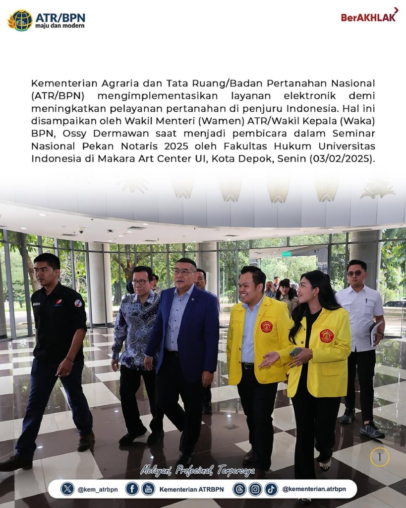 Kementerian Agraria dan Tata Ruang/Badan Pertanahan Nasional (ATR/BPN) mengimplementasikan layanan elektronik demi meningkatkan pelayanan pertanahan di penjuru Indonesia. Hal ini disampaikan oleh Wakil Menteri (Wamen) ATR/Wakil Kepala (Waka) BPN, Ossy Dermawan saat menjadi pembicara dalam Seminar Nasional Pekan Notaris 2025 oleh Fakultas Hukum Universitas Indonesia di Makara Art Center UI, Kota Depok, Senin (03/02/2025).