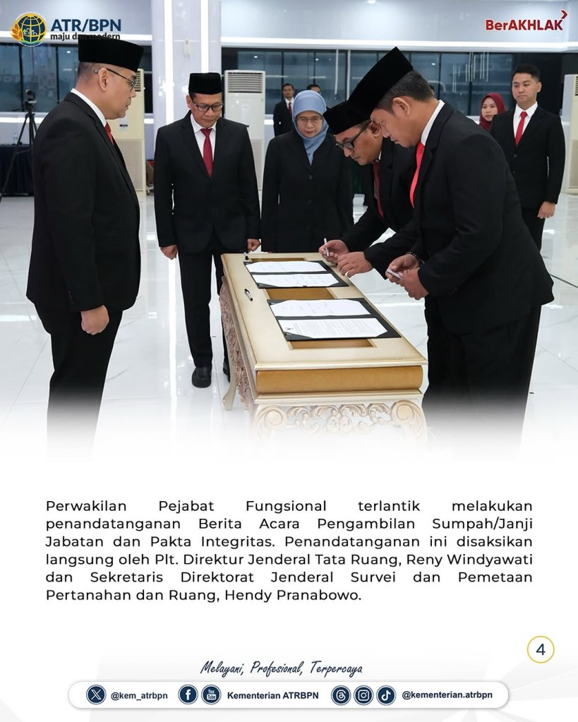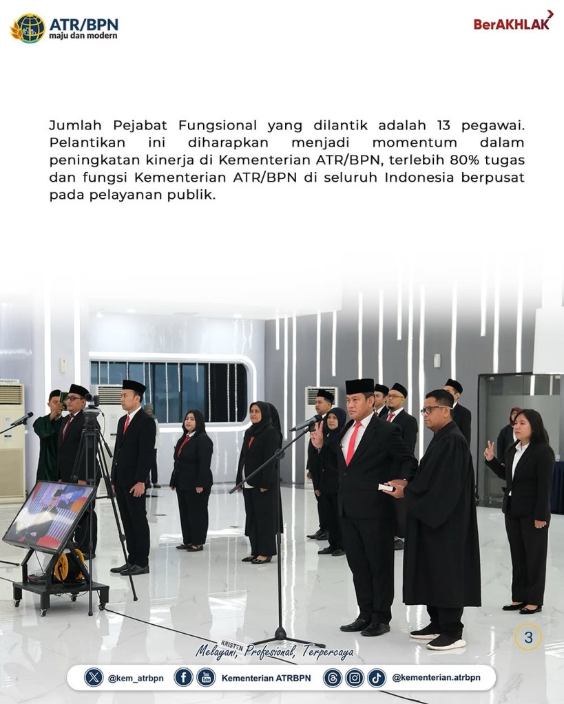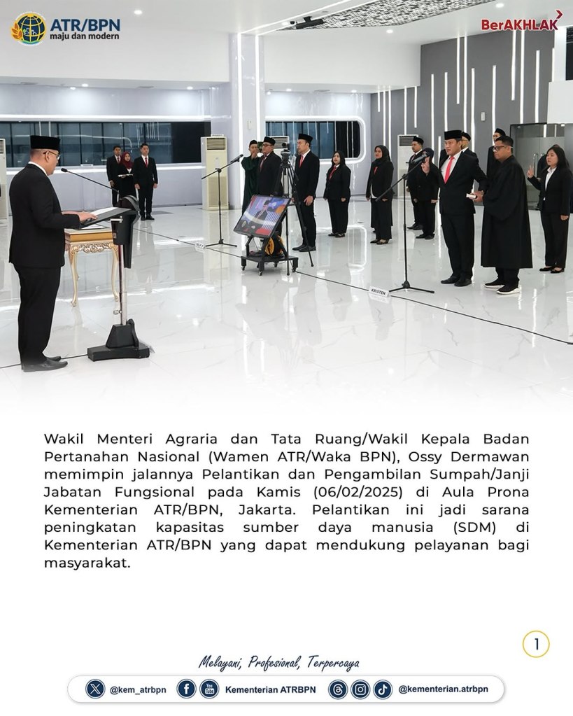 Wakil Menteri Agraria dan Tata Ruang/Wakil Kepala Badan Pertanahan Nasional (Wamen ATR/Waka BPN), Ossy Dermawan memimpin jalannya Pelantikan dan Pengambilan Sumpah/Janji Jabatan Fungsional pada Kamis (06/02/2025) di Aula Prona Kementerian ATR/BPN, Jakarta. Pelantikan ini jadi sarana peningkatan kapasitas sumber daya manusia (SDM) di Kementerian ATR/BPN yang dapat mendukung pelayanan bagi masyarakat.