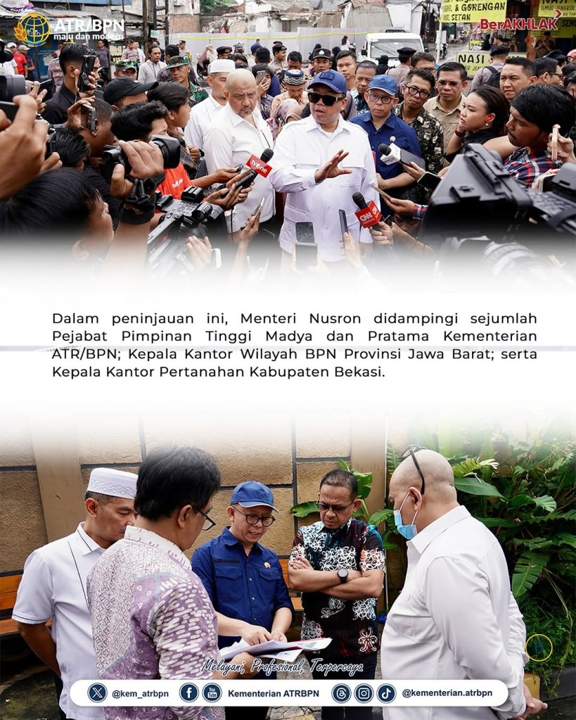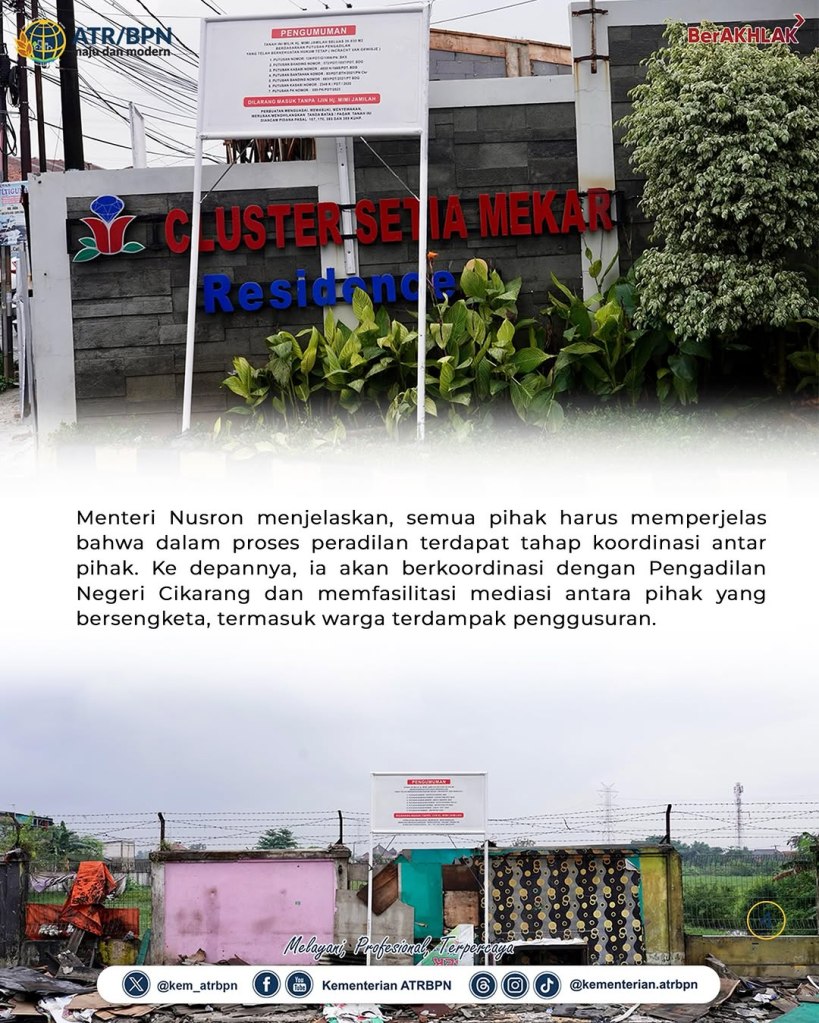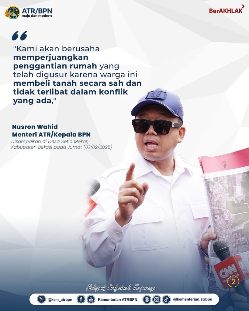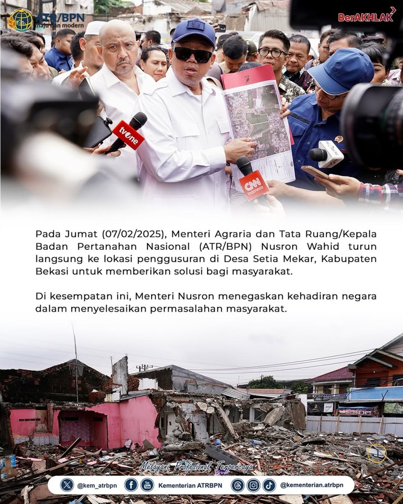 Menteri Agraria dan Tata Ruang/Kepala Badan Pertanahan Nasional (ATR/BPN) Nusron Wahid turun langsung ke lokasi penggusuran di Desa Setia Mekar, Kabupaten Bekasi untuk memberikan solusi bagi masyarakat. Dengan demikian, Menteri Nusron menegaskan kehadiran negara dalam menyelesaikan permasalahan masyarakat.