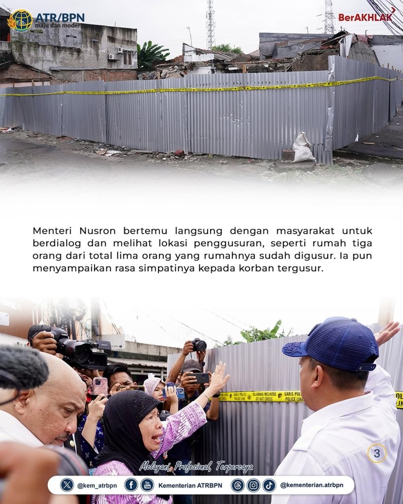 “Saya bersyukur pada hari ini saya bisa ketemu dengan Bu Asmawati, Ibu Mursiti, dengan Pak Yaldi. Tadi di sana meninjau lokasi lima rumah dari ibu, bertiga dari lima orang yang rumahnya sudah digusur,” ujar Menteri Nusron usai meninjau kondisi fisik dari penggusuran rumah di Kabupaten Bekasi, Jumat (07/02/2025).