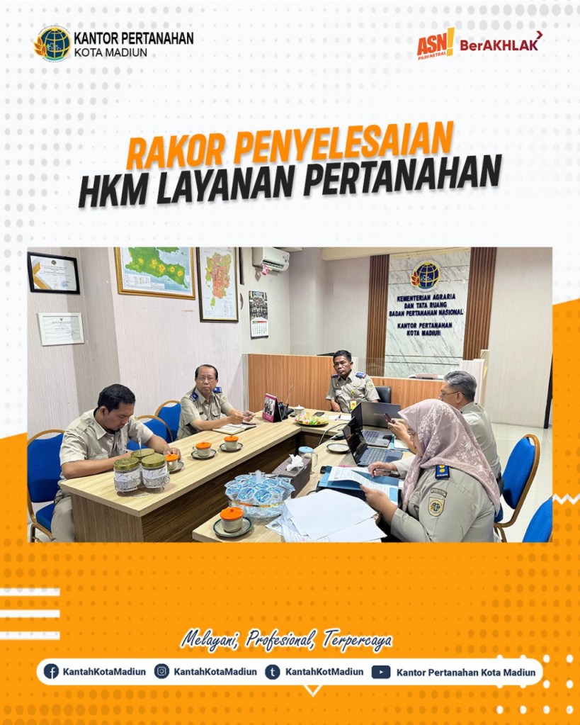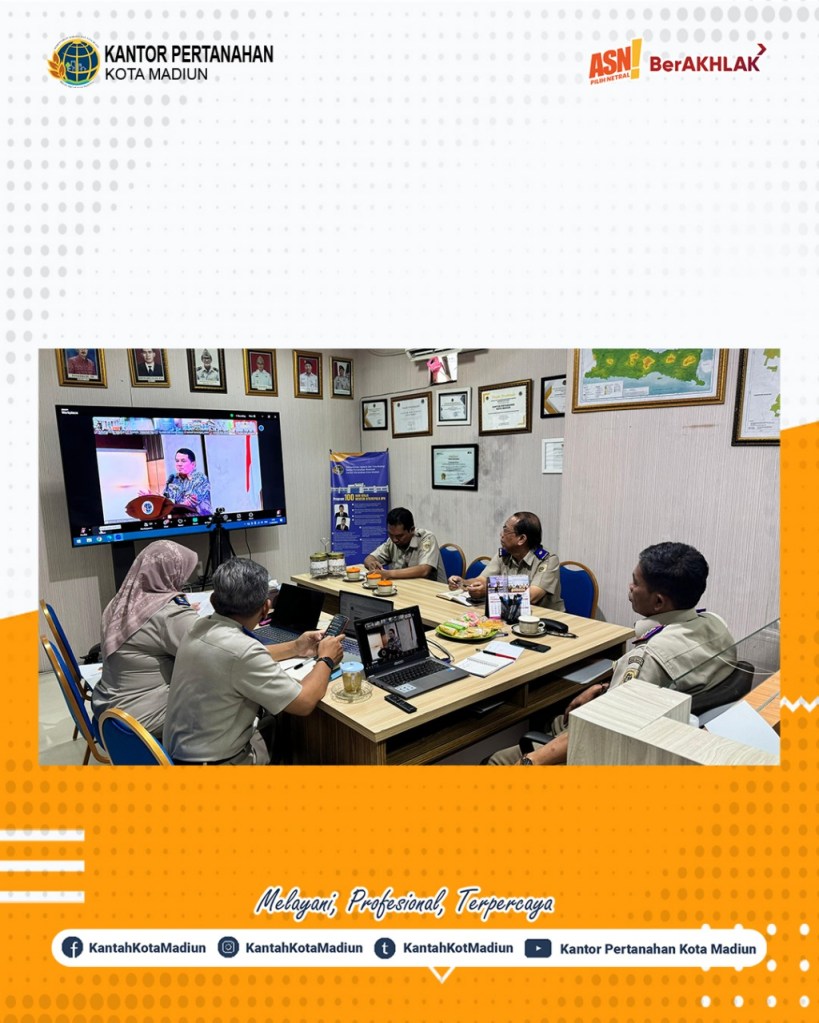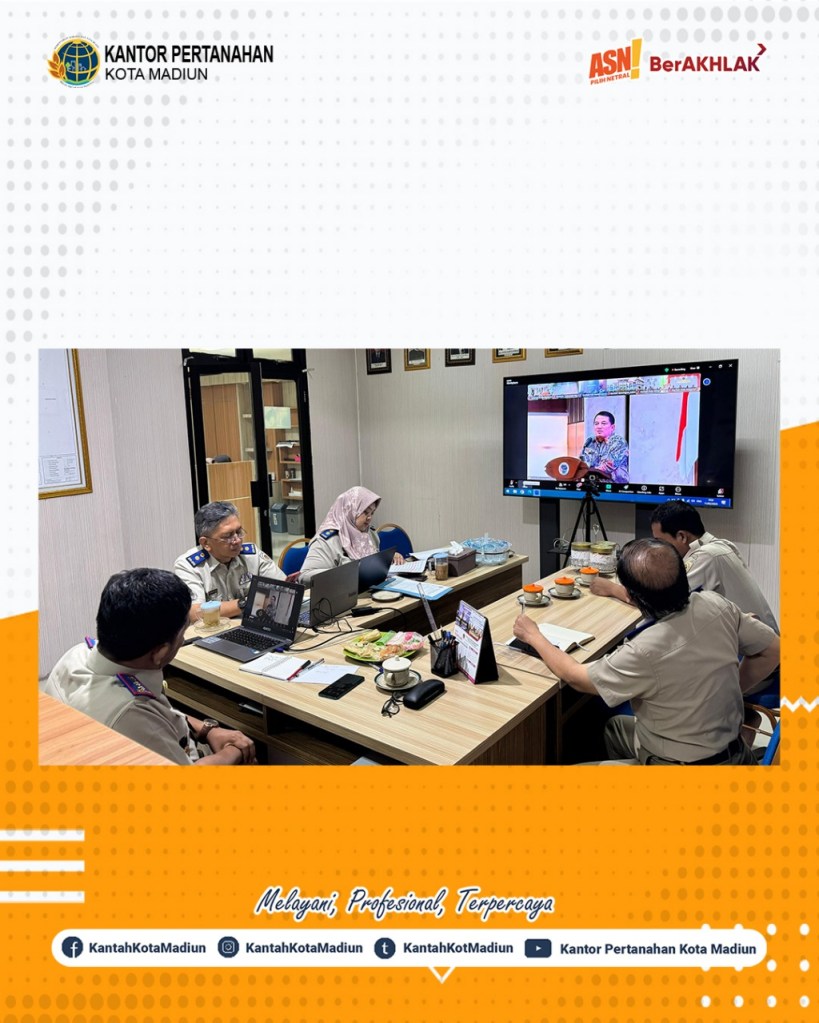 Halo #SobATRBPN, Hari ini Selasa (11/02/2025) Kantor Pertanahan Kota Madiun mengikuti Rapat Koordinasi Penyelesaian Hambatan Kendala Masalah Layanan Pertanahan yang diadakan oleh Kantor Wilayah Badan Pertanahan Nasional Provinsi Jawa Timur. Turut hadir Kepala Kantor Pertanahan Kota Madiun, Bapak Triawan Saleh, S.T., M.Si., dan diikuti juga oleh seluruh Pejabat Pengawas Kantor Pertanahan Kota Madiun.