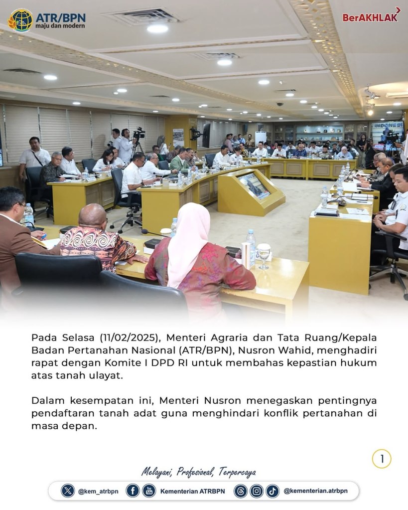 Menteri Agraria dan Tata Ruang/Kepala Badan Pertanahan Nasional (ATR/BPN), Nusron Wahid, menegaskan komitmen pemerintah dalam memberikan kepastian hukum atas tanah ulayat. Dalam rapat dengan Komite I Dewan Perwakilan Daerah Republik Indonesia (DPD RI), pada Selasa (11/02/2025), ia menekankan pentingnya pendaftaran tanah adat untuk menghindari konflik pertanahan di masa depan.