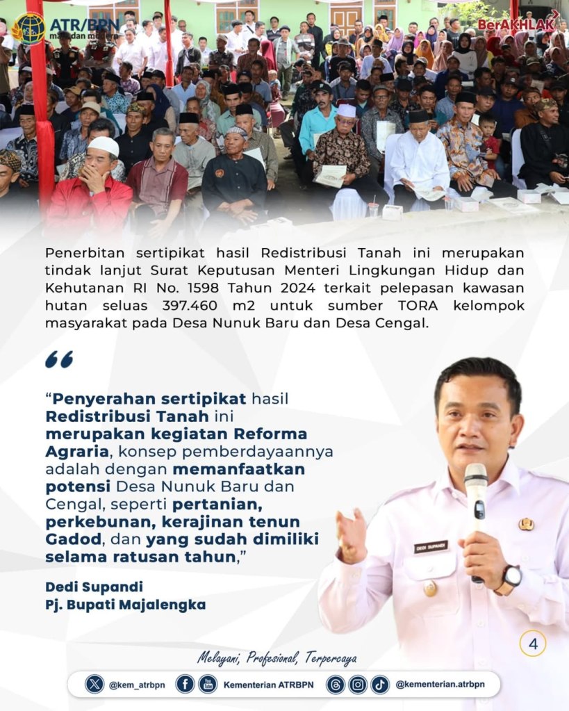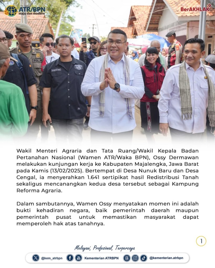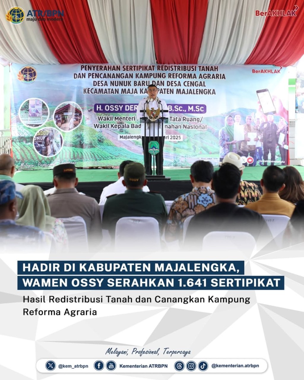 Wakil Menteri Agraria dan Tata Ruang/Wakil Kepala Badan Pertanahan Nasional (Wamen ATR/Waka BPN), Ossy Dermawan menyerahkan 1.641 sertipikat hasil Redistribusi Tanah di Kabupaten Majalengka, Jawa Barat pada Kamis (13/02/2025). Ia menyatakan, penyerahan sertipikat ini adalah bentuk komitmen negara mewujudkan keadilan dan kesejahteraan rakyatnya.