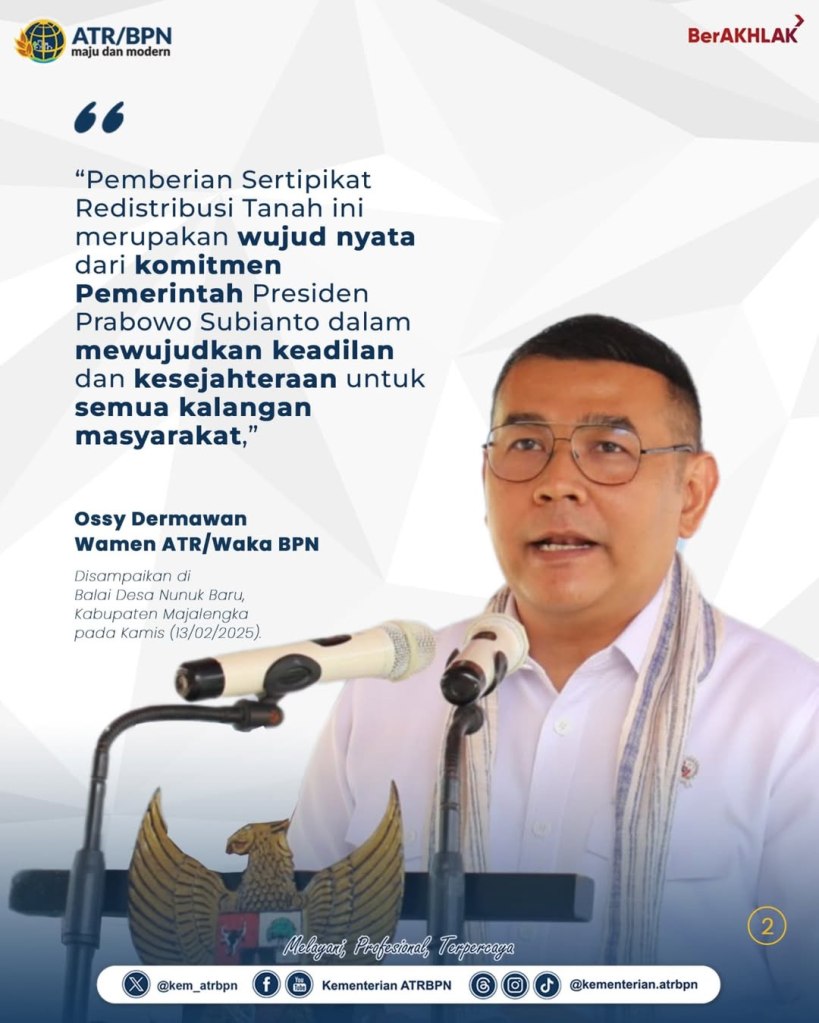 “Pemberian Sertipikat Redistribusi Tanah ini merupakan wujud nyata dari komitmen Pemerintah Presiden Prabowo Subianto dalam mewujudkan keadilan dan kesejahteraan untuk semua kalangan masyarakat. Ini juga bukti bahwa negara hadir, baik pemerintah daerah maupun pemerintah pusat, untuk memastikan masyarakat dapat memperoleh hak atas tanahnya,” tegas Wamen Ossy Dermawan di Balai Desa Nunuk Baru, Kabupaten Majalengka.