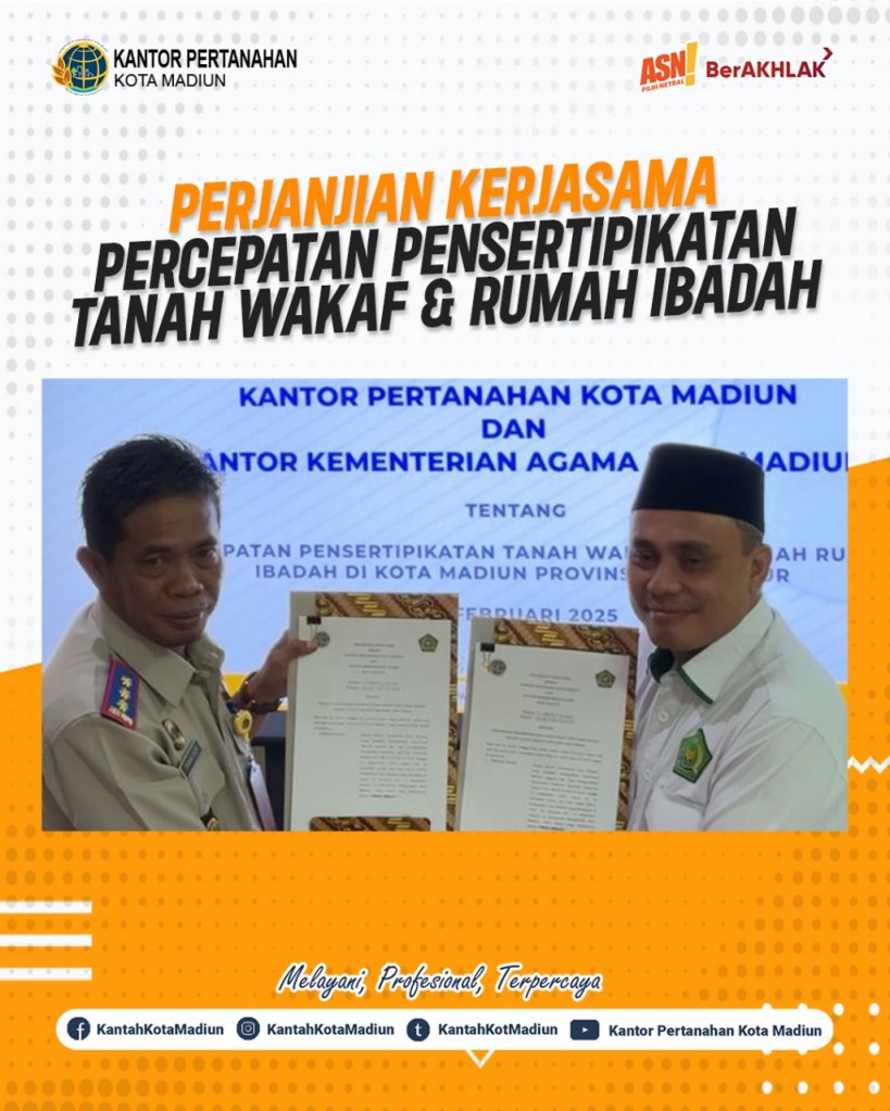 Halo #SobATRBPN, Hari ini Senin (24/02/2025) Bertempat di Kantor Pertanahan Kota Madiun, Kepala Kantor Pertanahan Kota Madiun, Bapak Triawan Saleh, S.T., M.Si. melaksanakan Perjanjian Kerja Sama dengan Kementerian Agama Kota Madiun yang dihadiri oleh Bapak M. Zainut Tamam selaku Kepala Kantor Kementerian Agama Kota Madiun, Perjanjian Kerja Sama berisi tentang Percepatan Pensertipikatan Tanah Wakaf dan Tanah Rumah Ibadah di Kota Madiun.