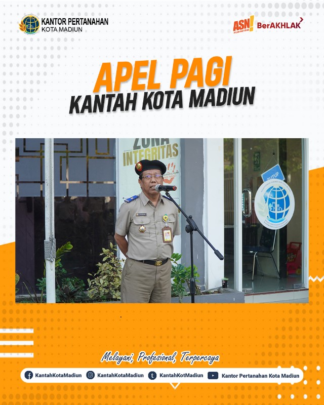Halo #SobATRBPN, Hari ini Selasa (25/02/2025) Kantor Pertanahan Kota Madiun melaksanakan Apel Pagi yang bertempat di Halaman Depan Kantor Pertanahan Kota Madiun. Yang bertindak sebagai Pembina Upacara, Kepala Seksi Pengadaan Tanah dan Pengembangan, Bapak Geger Teguh Juwono, A.Ptnh. dan diikuti oleh seluruh Pejabat Pengawas dan Jajaran Kantor Pertanahan Kota Madiun.