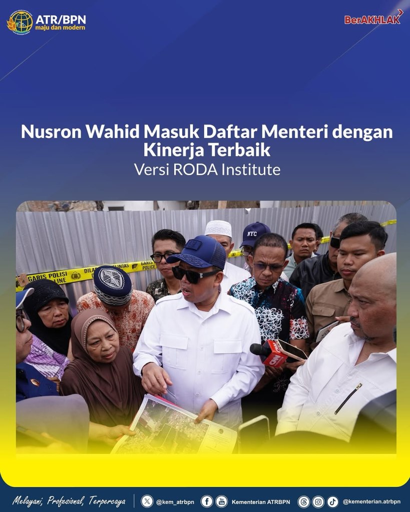 Menteri Agraria dan Tata Ruang/Kepala Badan Pertanahan Nasional (ATR/BPN), Nusron Wahid, dikategorikan sebagai lima Menteri Kabinet Merah Putih dengan kinerja terbaik berdasarkan hasil riset dari Research Oriented Development Analysis (RODA) Institute. Riset ini secara resmi dirilis pada Rabu (19/02/2025) lalu.