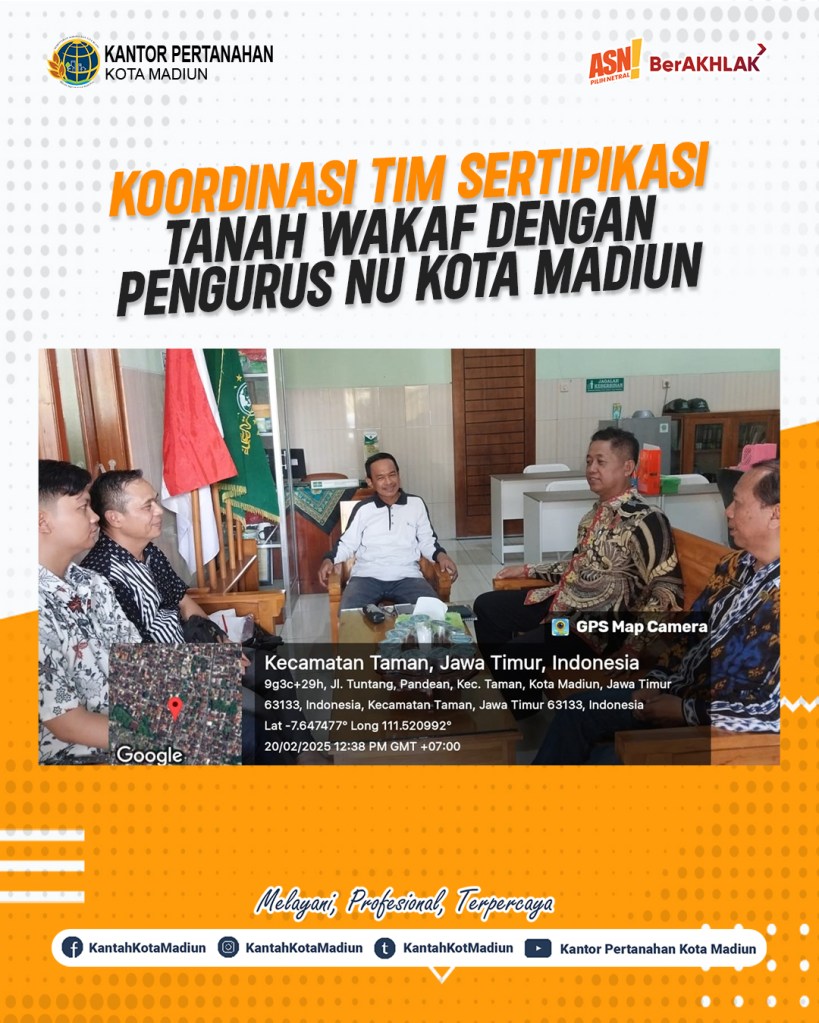 Halo #SobATRBPN, Kamis (20/02/2025) Kantor Pertanahan Kota Madiun melaksanakan koordinasi tim sertipikasi tanah wakaf dengan Pengurus Cabang NU Kota Madiun. Turut hadir Kepala Seksi Penataan dan Pemberdayaan, Bapak Dwi Joko Susilo, A.Ptnh., M.M. dan ditemani oleh Kepala Seksi Pengadaan Tanah dan Pengembangan, Bapak Geger Teguh Juwono, A.Ptnh.