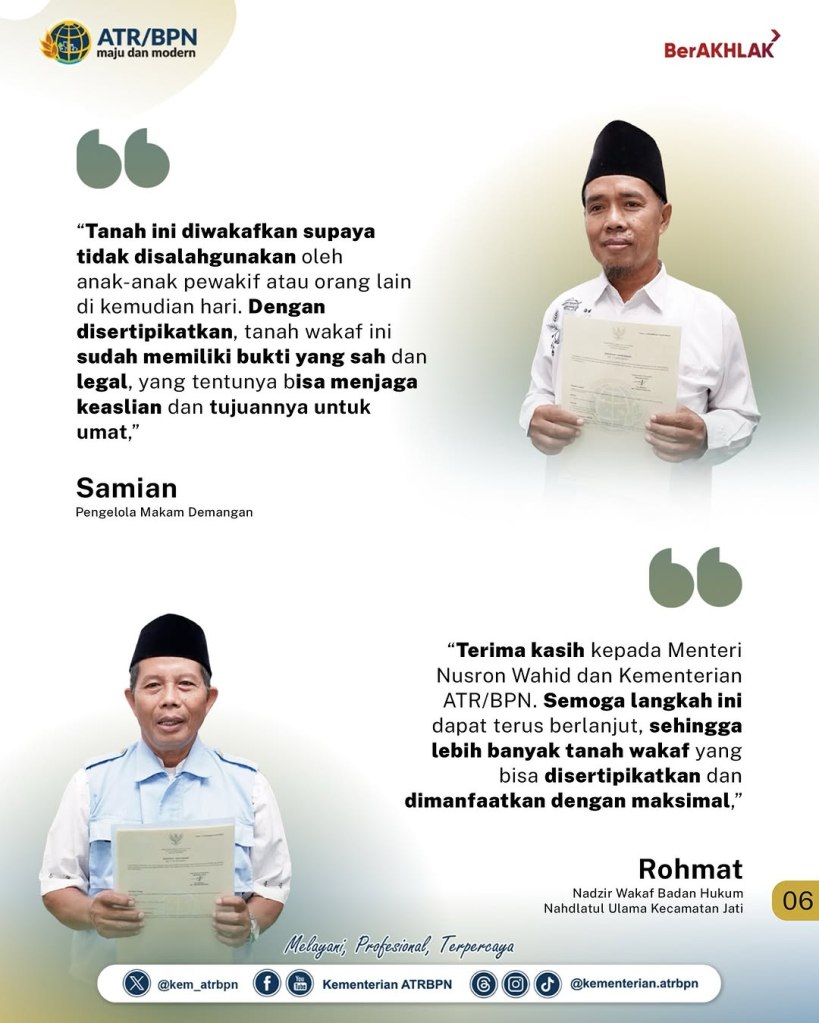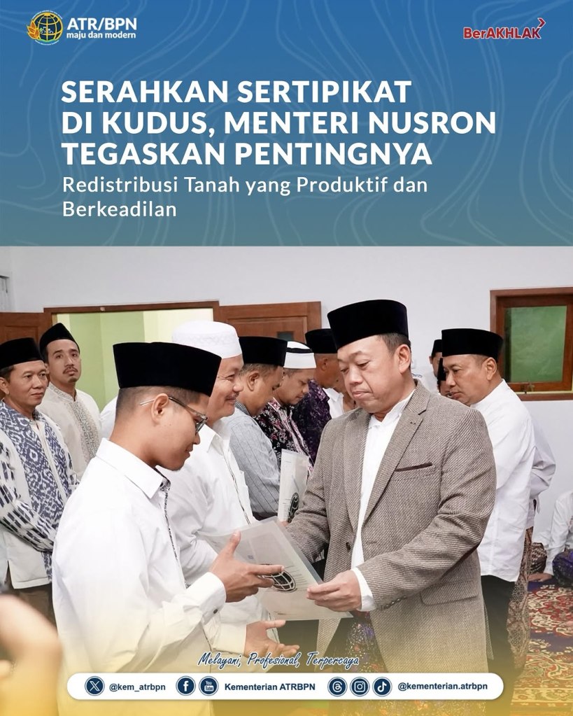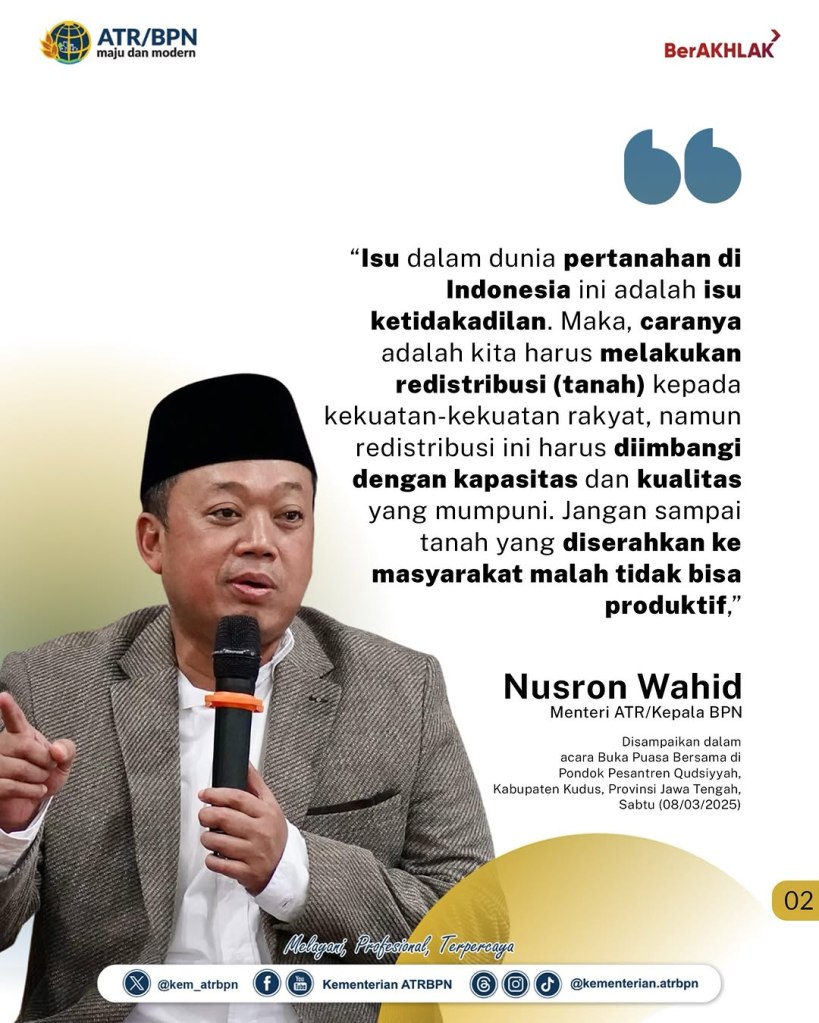 “Isu dalam dunia pertanahan di Indonesia ini adalah isu ketidakadilan. Maka, caranya adalah kita harus melakukan redistribusi (tanah) kepada kekuatan-kekuatan rakyat, namun redistribusi ini harus diimbangi dengan kapasitas dan kualitas yang mumpuni. Jangan sampai tanah yang diserahkan ke masyarakat malah tidak bisa produktif,” ujar Menteri Nusron saat menyerahkan 20 sertipikat tanah wakaf dalam acara Buka Puasa Bersama di Pondok Pesantren Qudsiyyah, Kabupaten Kudus, Jawa Tengah, Sabtu (08/03/2025).